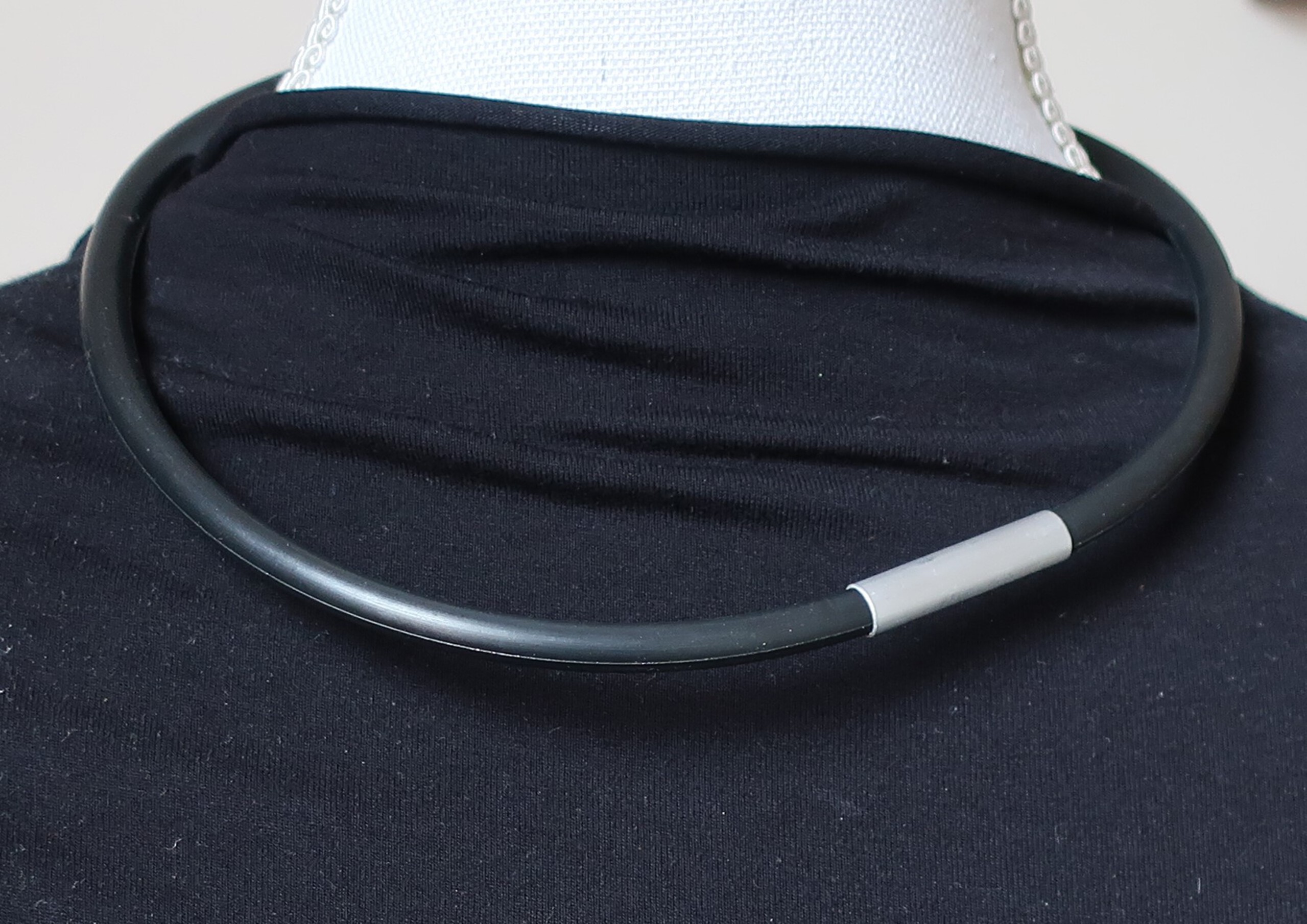 Soms ontstaat een sieraad bij toeval. We waren bezig om te kijken welke aluminiumbuis we mogelijk als sluiting zouden kunnen gebruiken. Al passend, zagen we ineens een sieraad ontstaan dat je op je schouders zou kunnen dragen. Het rubber is niet verlijmd dus er kan gedraaid en ingekort worden. Op een andere foto zie je hoe het schouderstuk in een rechte lijn, gedragen worden. Maar het kan ook met een lichte draaiing of dubbel gedragen worden. Het blijft verrassend goed zitten als je je beweegt en kan zelfs onder een jas(je) gedragen worden.