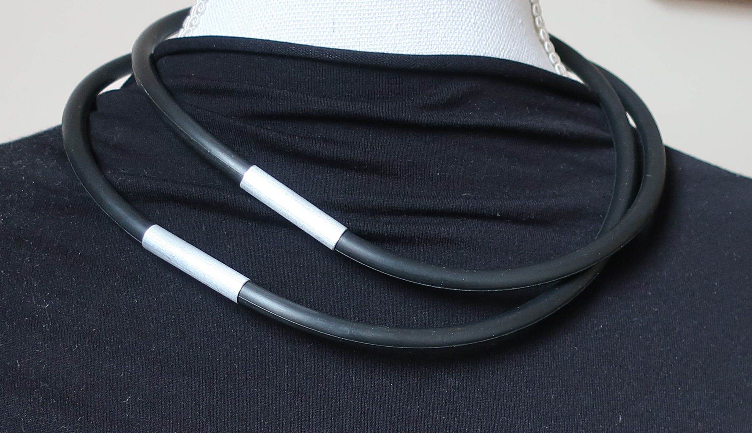 Soms ontstaat een sieraad bij toeval. We waren bezig om te kijken welke aluminiumbuis we mogelijk als sluiting zouden kunnen gebruiken. Al passend, zagen we ineens een sieraad ontstaan dat je op je schouders zou kunnen dragen. Het rubber is niet verlijmd dus er kan gedraaid en ingekort worden. Op een andere foto zie je hoe het volledige schouderstuk in een rechte lijn, gedragen worden. Maar het kan ook met een lichte draaiing of ingekort gedragen worden. Ook het hele sieraad blijft verrassend goed zitten als je je beweegt en kan zelfs onder een jas(je) gedragen worden.