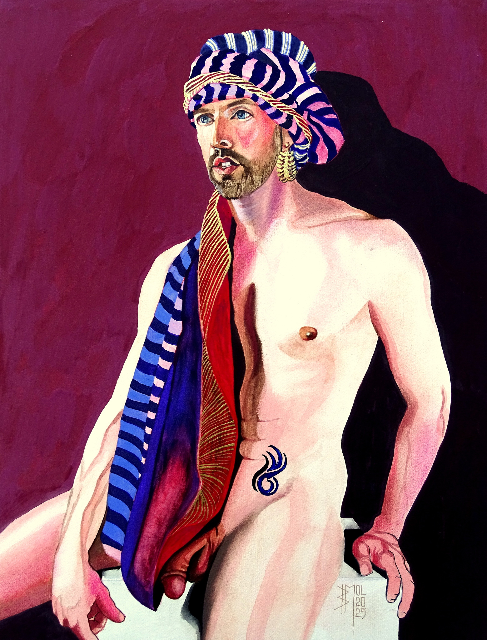 latest painting of my model Johan , this time wearing a scarf , arabian style. april 2025. This painting has a dark red mount ( passe-partout) and it`s 50x60cm