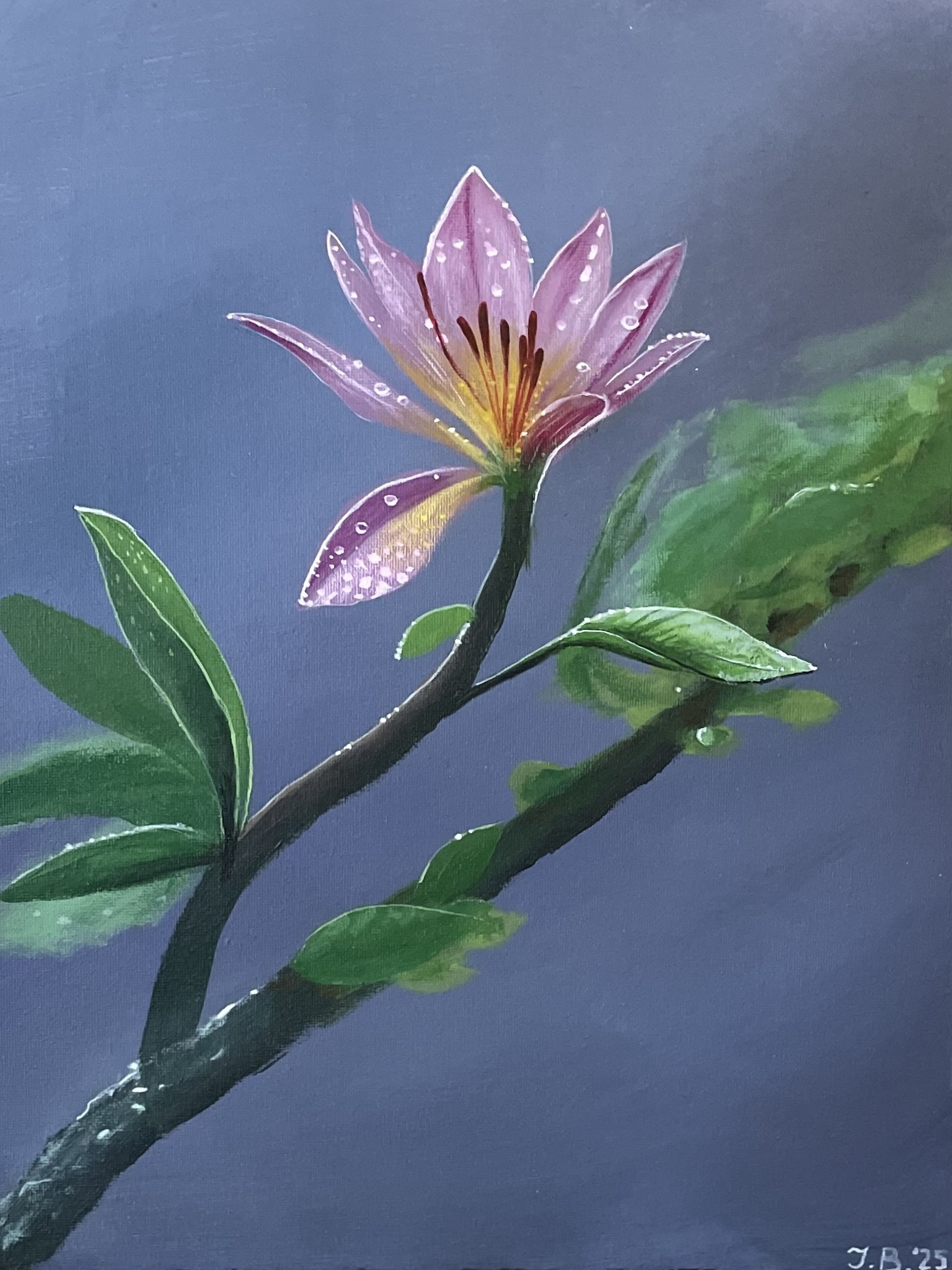 De uitdaging bij dit schilderij is om de juiste focus te krijgen op het onderwerp: de bloem. Wat verder van het onderwerp af staat heeft geen scherpe gedetailleerde randen en wordt door ons waargenomen als achtergrond.