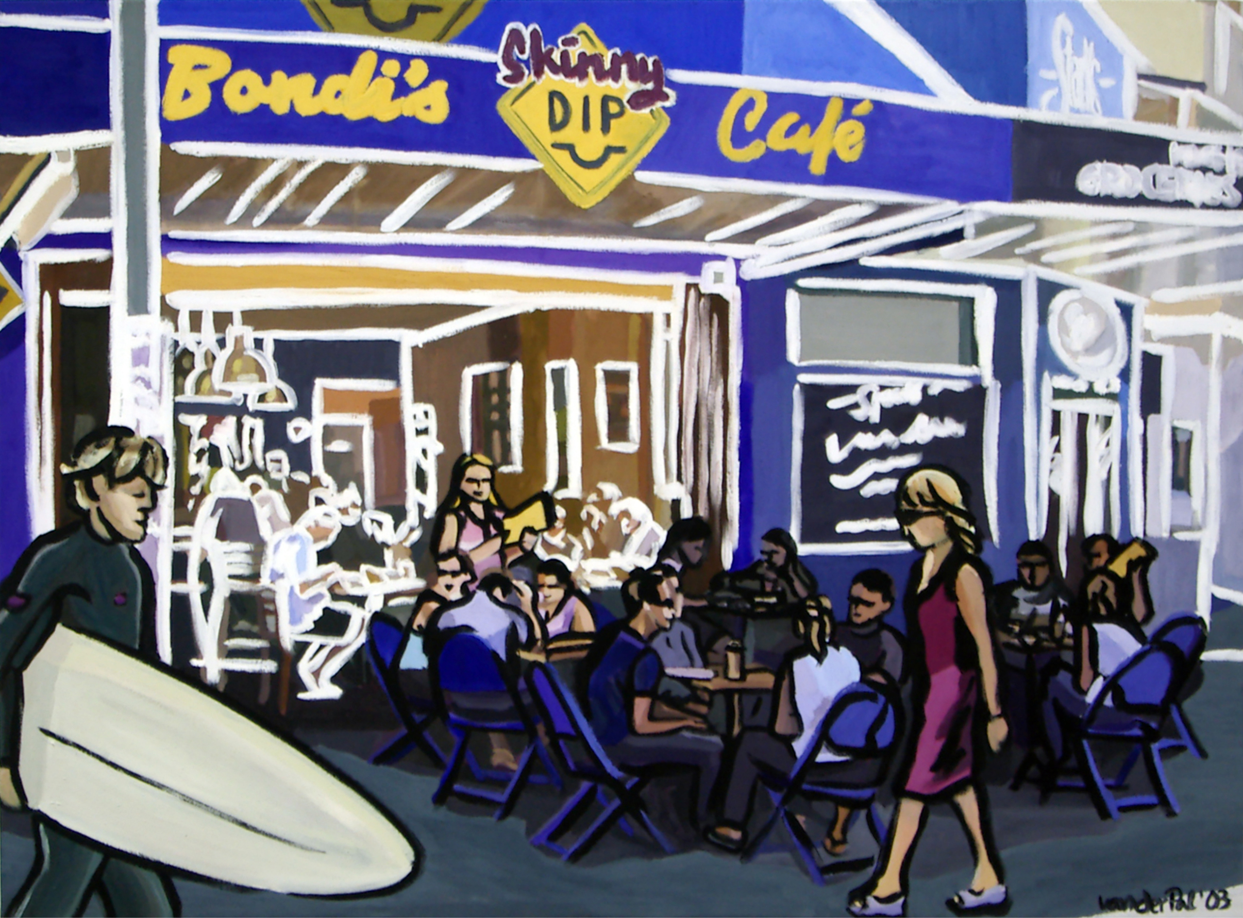 Weergeving van sociaal en cultureel unieke momenten in een grafisch beinvloede schilderstijl, olieverf op doek.