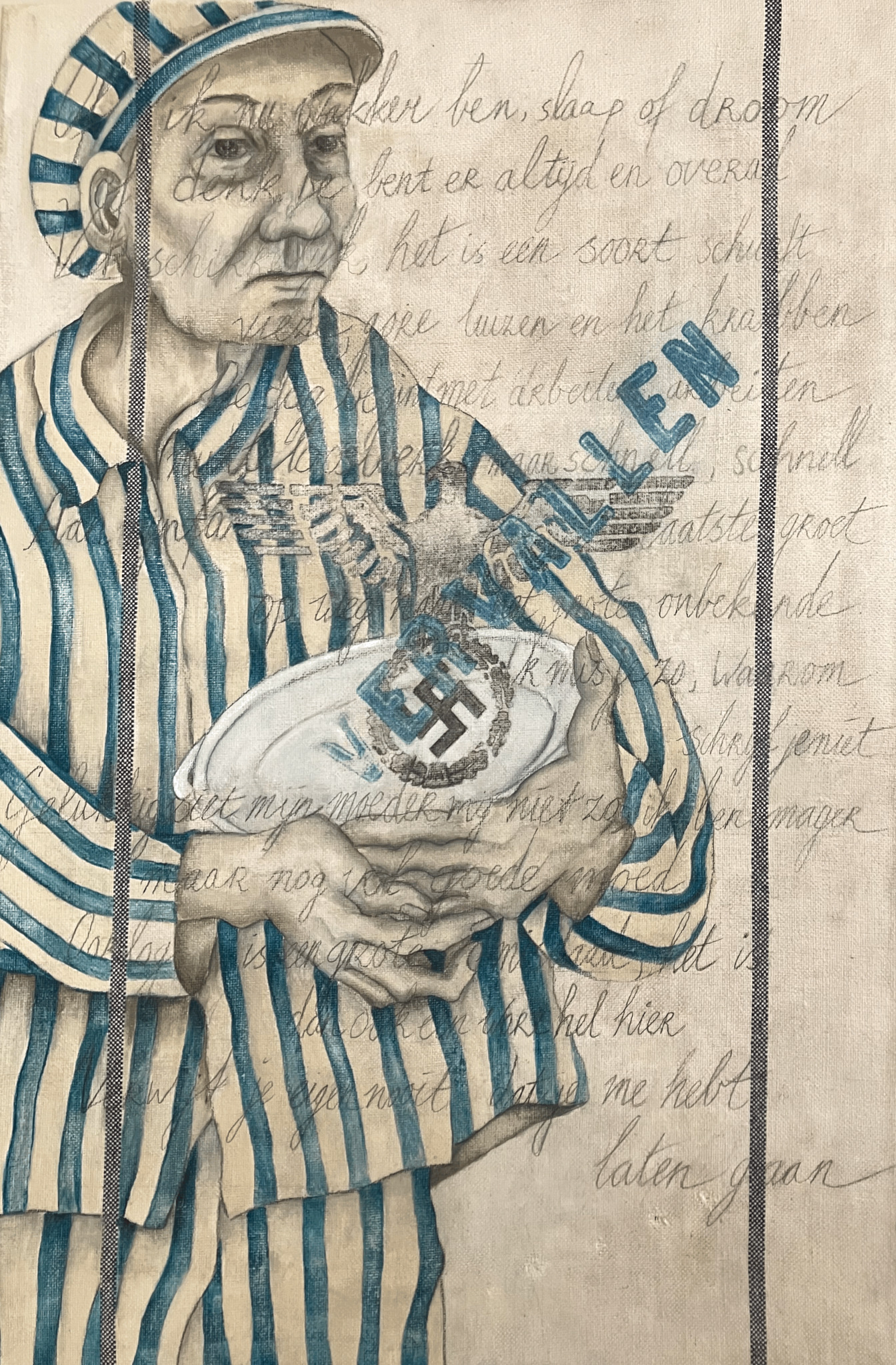 Toen na de oorlog alle verschrikkingen boven tafel kwamen, was er een duidelijk antwoord: “Nie Wieder”. Maar het lijkt of men dit is vergeten. Sommige mensen trekken zelfs het bestaan van de concentratiekampen in twijfel. En anderen beweren dat de slachtoffers van toen, nu daders zijn geworden...... Met dit werk, waarin teksten verwerkt zijn van briefjes uit concentratie-kampen en de Arbeitseinsatz en een afbeelding van een kampgevangenen naar Jan Budding (een Nederlandse tekenaar en overlevende uit kamp Sachsenhausen), hoop ik dat de kijker bewust blijft van de verschrikkingen van oorlog en iets onderneemt, al is het maar klein. Spreek je uit, doe iets, zodat “Nie Wieder” echt “Nie Wieder” wordt.