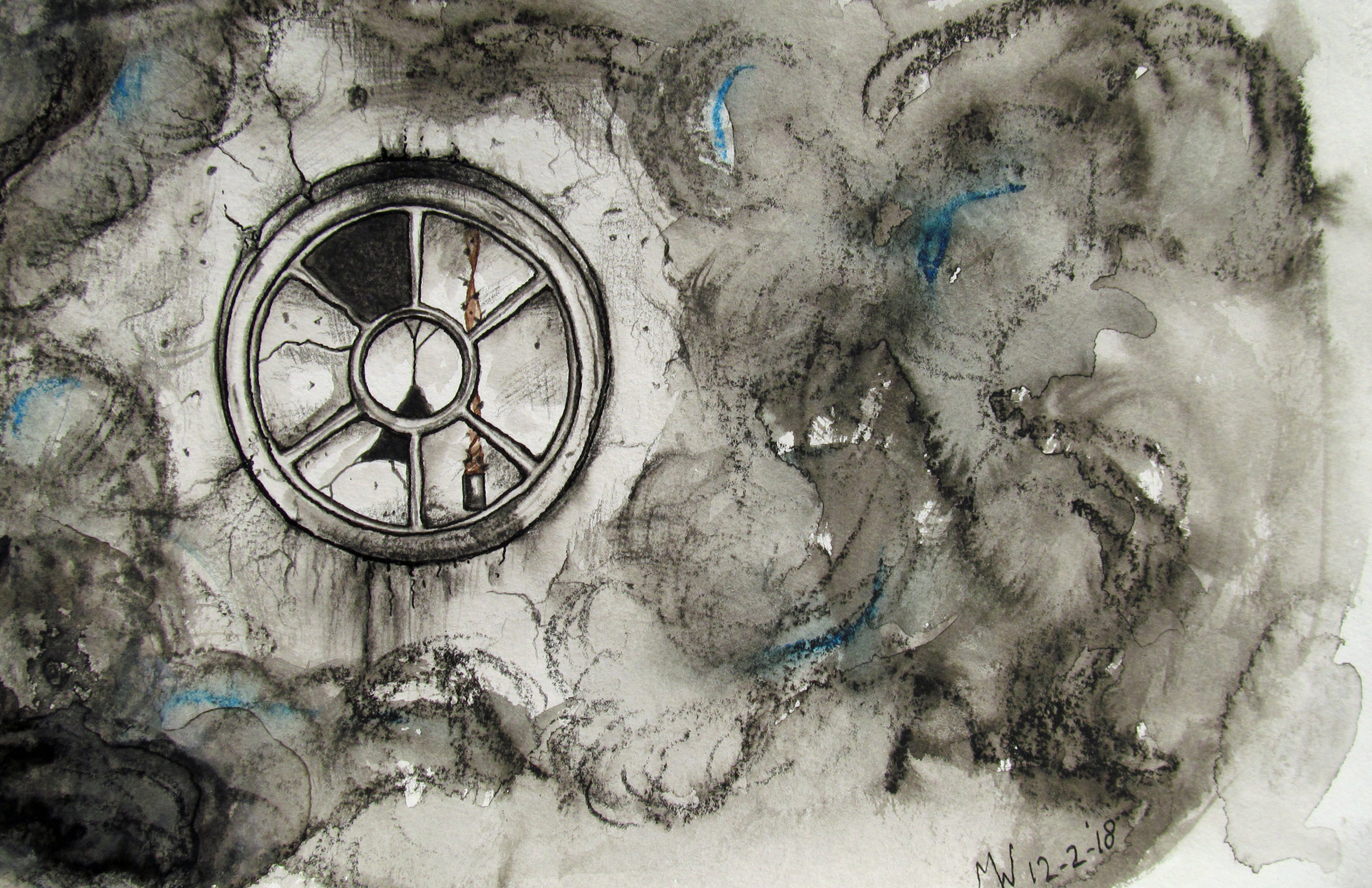 Oud vensterraam met vliegenvanger. Uit een serie van 3. Aquarelpotloden en water op 265 grams mixed media papier.