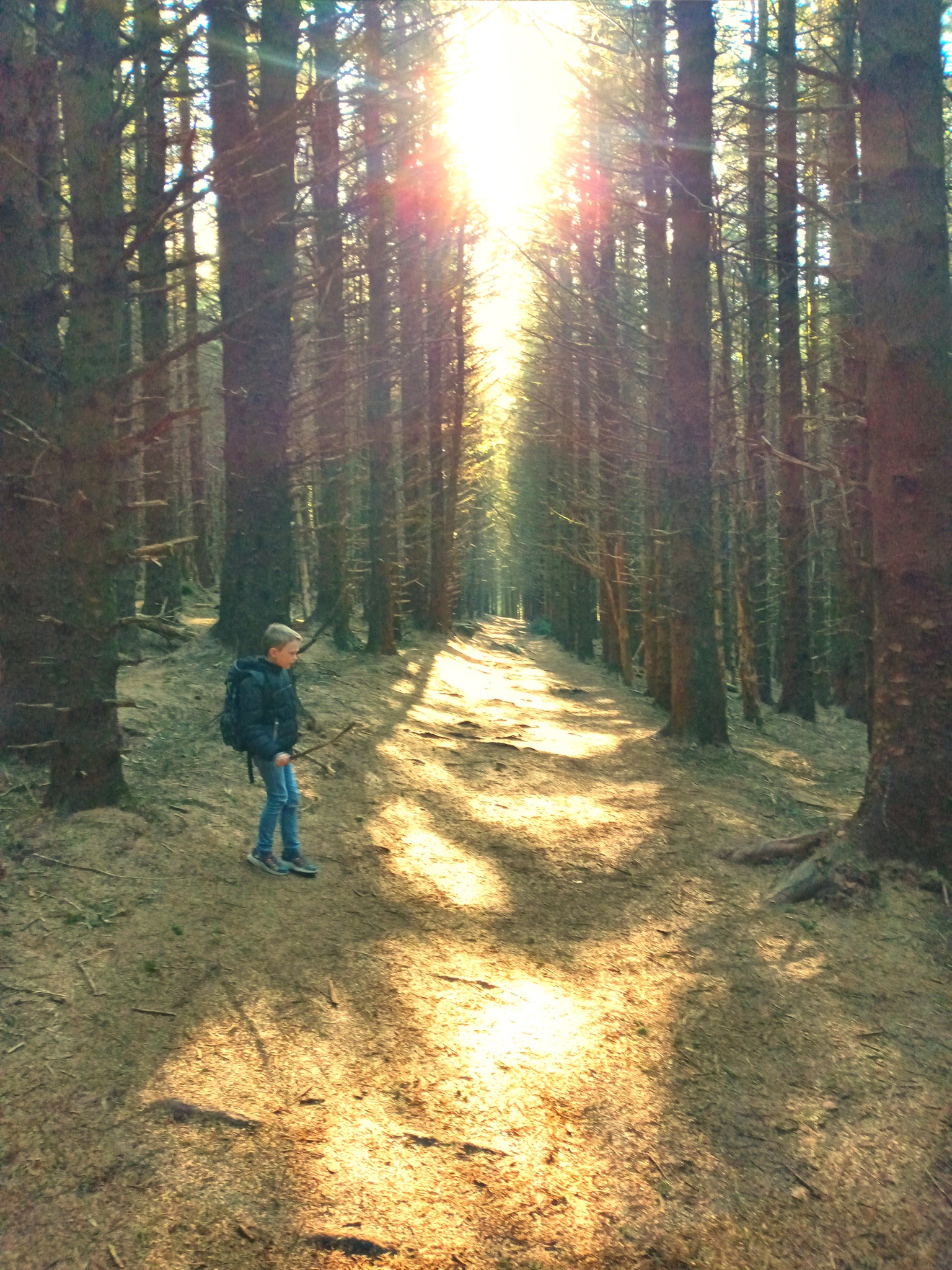 Bos met een pad van gouden licht en een jongen die nieuwsgierig komt kijken