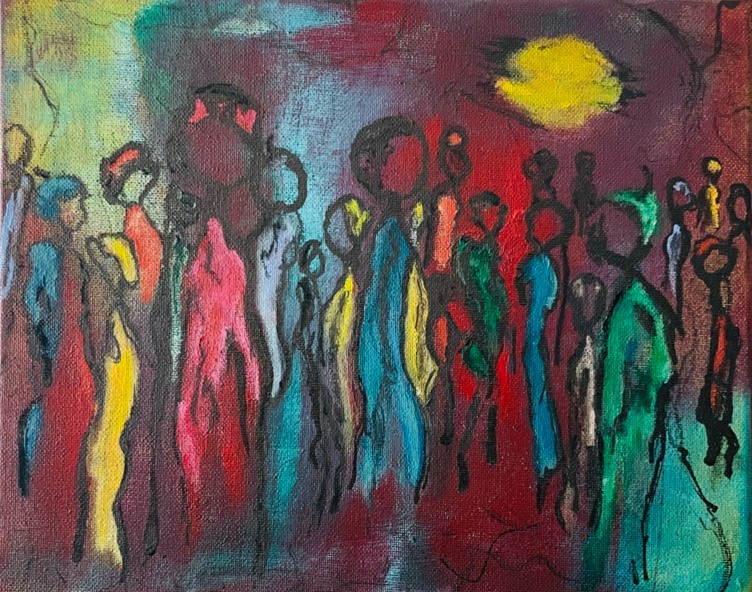 Schilderij Mensen Acryl Spiritueel Kleuren Doek Hemel Chaos Verbondenheid Peinture Wirwar Ensemble Contouren Couleurs Contours Capturé Connectivé