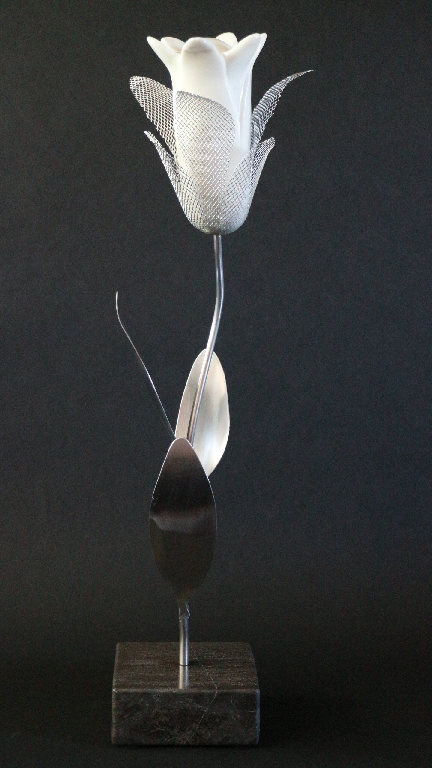 Deze bloem is reeds ontloken en lijkt zich te verheffen om zo duidelijk mogelijk zijn schoonheid ten toon te spreiden. Het fragiele van een bloemknop zie je af aan de bladeren rond de knop, die gemaakt zijn van Aluminiumgaas. Het gaas is vrij kwetsbaar, maar ook beschermend: het is scherp aan de randen. De knop zelf is gemaakt uit Marmer. De materialen gaan levenslang mee, dus geen zorgen dat de bloem verwelkt. Uiteraard is voeding, bestrijdingsmiddelen en water in het geheel niet nodig, zodat deze bloem zeer milieu vriendelijk is en zeer duurzaam. Het is min of meer een combinatie van de serie “Popping Flowers” en het sculptuur “Grow of Metal Leaves”. Het Marmer is gecombineerd met Aluminiumgaas en op een steel gezet van RVS met 3 RVS bladeren. Het geheel is gemonteerd op een sokkel van hardsteen.