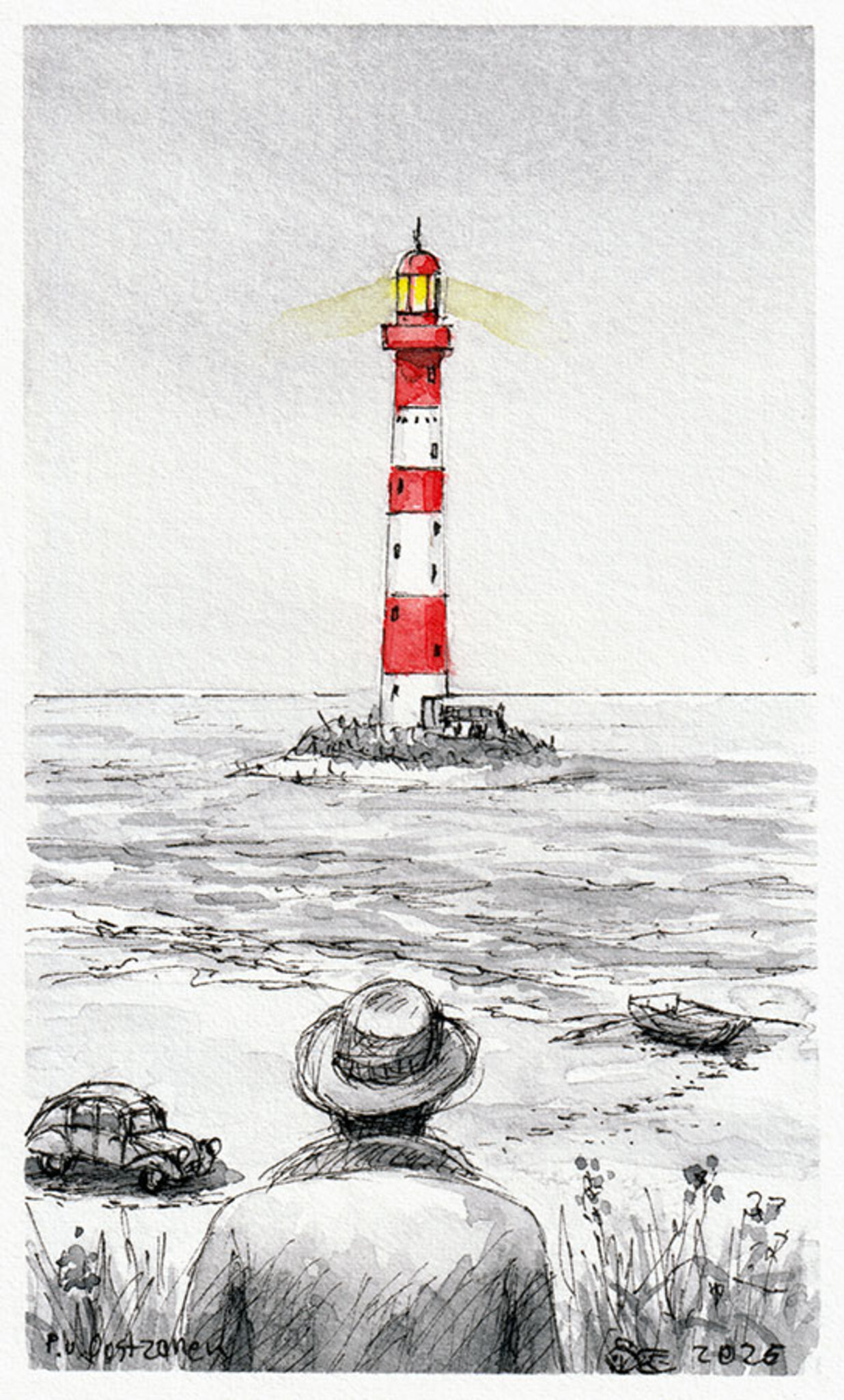 Een eenzame figuur staart naar de vuurtoren, die als een baken van licht boven de duistere zee uitrijst. De sfeer is mysterieus, alsof tijd en ruimte hier vervagen in een droomwereld. De gedetailleerde lijnen en subtiele kleuraccenten versterken de surrealistische stilte van het moment.