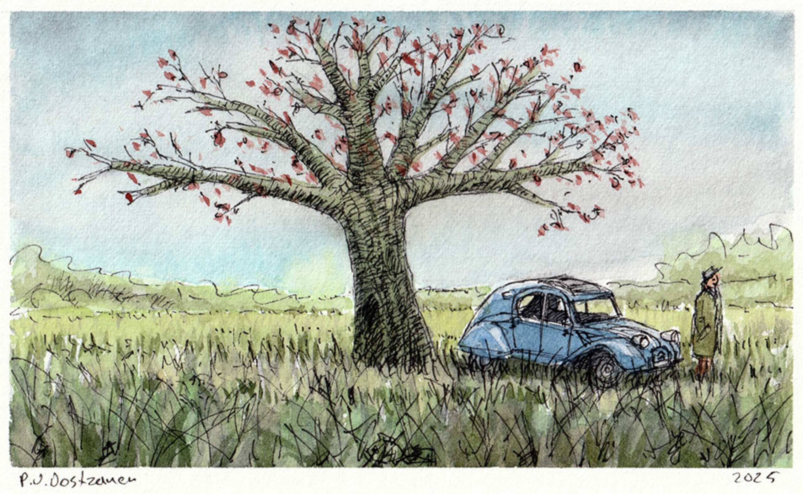 Een blauwe 2cv staat stil in een veld met hoog gras, naast een majestueuze boom met vurige rode bladeren. Een figuur in een groene jas kijkt weg van de boom, alsof hij in gedachten verzonken is wachtend op een ontmoeting. De tekening straalt een dromerige, tijdloze sfeer uit, waarin stilte en observatie centraal staan.