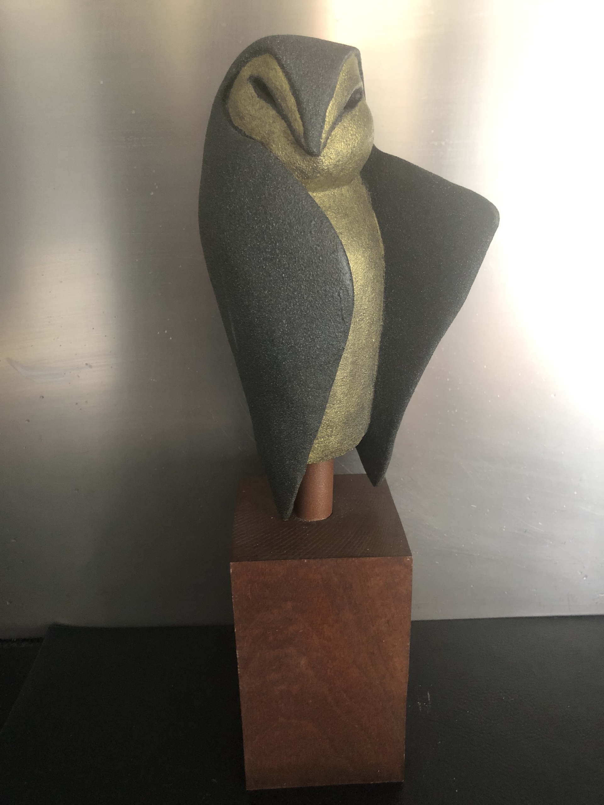 Zwart gouden uil van keramiek op staaf en houten sokkel.