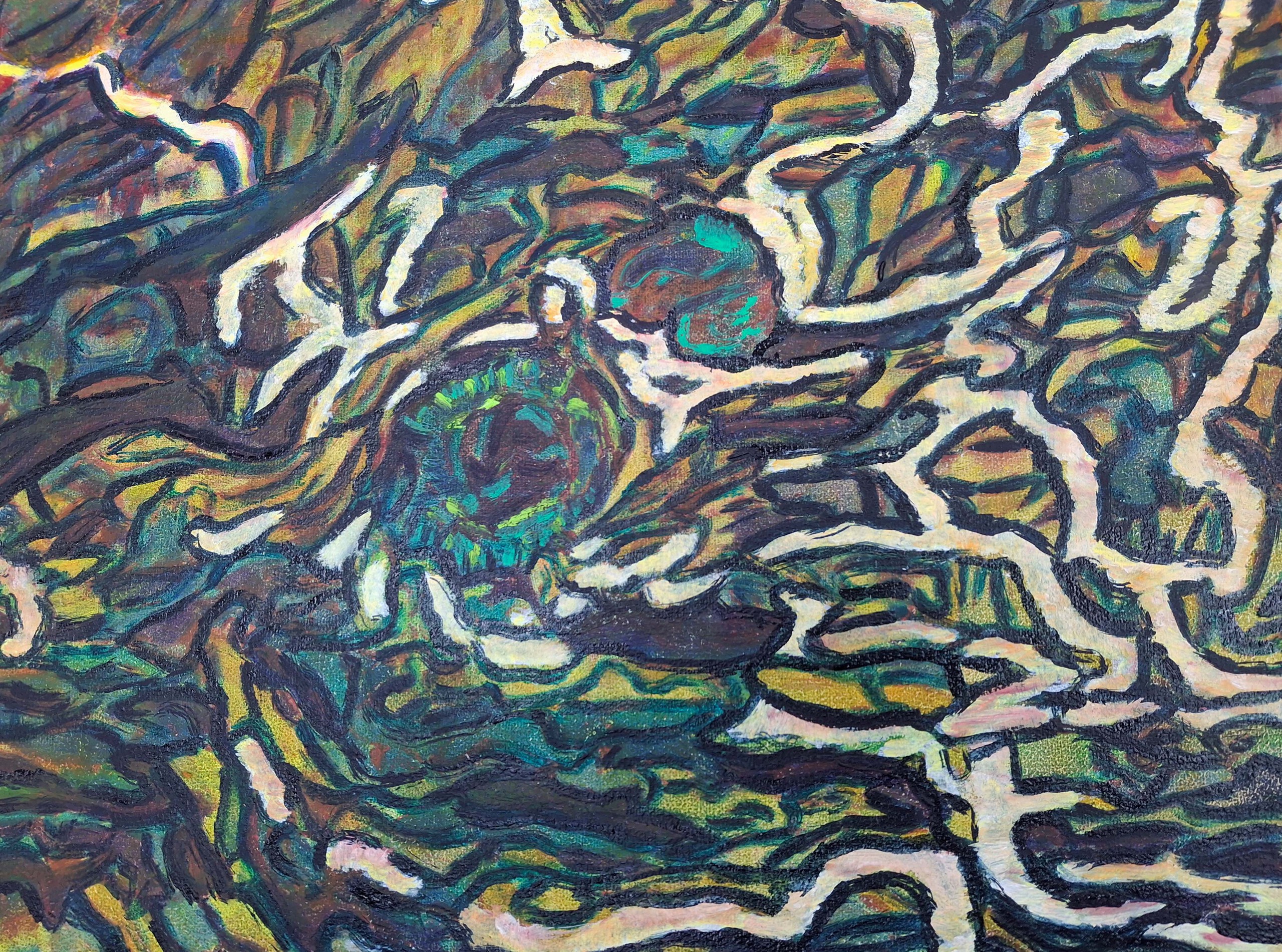 Zóveel schorsen, zóveel kleuiren. Dit schilderij 3-demensionaal gemaakt door er geschilderd plexiglas overheen te maken.