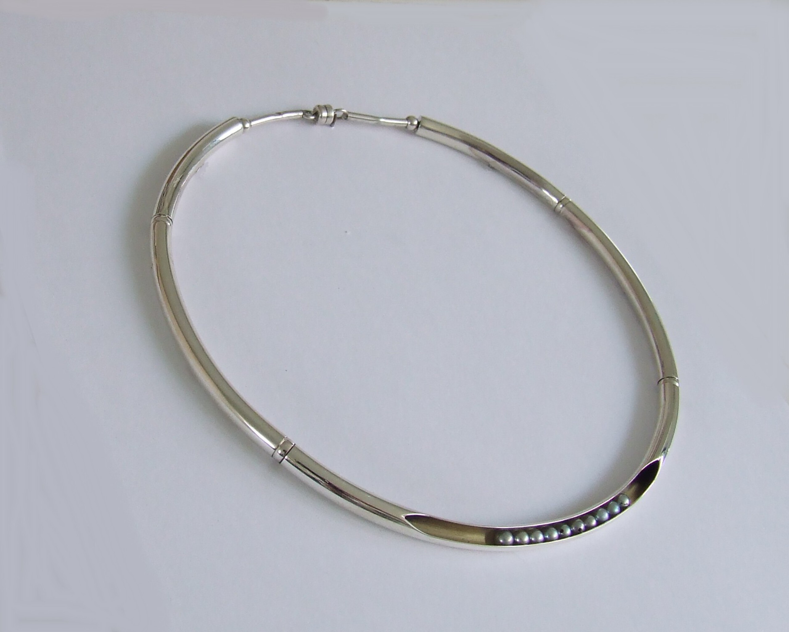 Zilveren halssieraad van 6 mm buismateriaal met vier verborgen scharnierpunten. In de buis is een sleuf gemaakt, waarvan de wand verguld is. Hierin kunnen de parels op elke beweging vrij heen en weer rollen. Het sieraad is voorzien van een magneetsluiting en is hoogglans gepolijst. (autonoom S1086, max.3)