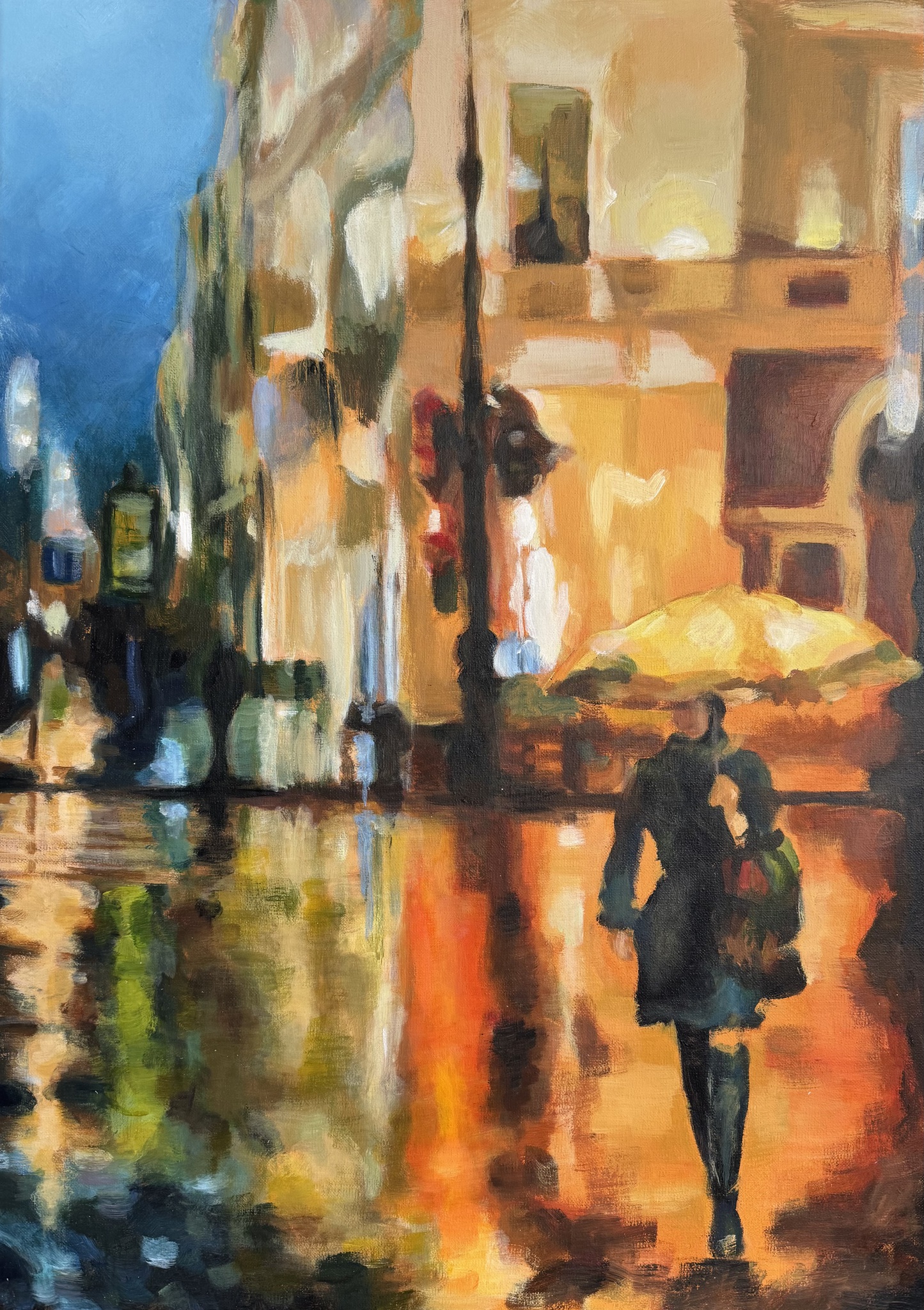 Dame Vrouw Paraplu Geel Okergeel Regen Weerkaatsing Nat Stad Acryl Verf Canvas Gebouwen Lucht Blauw