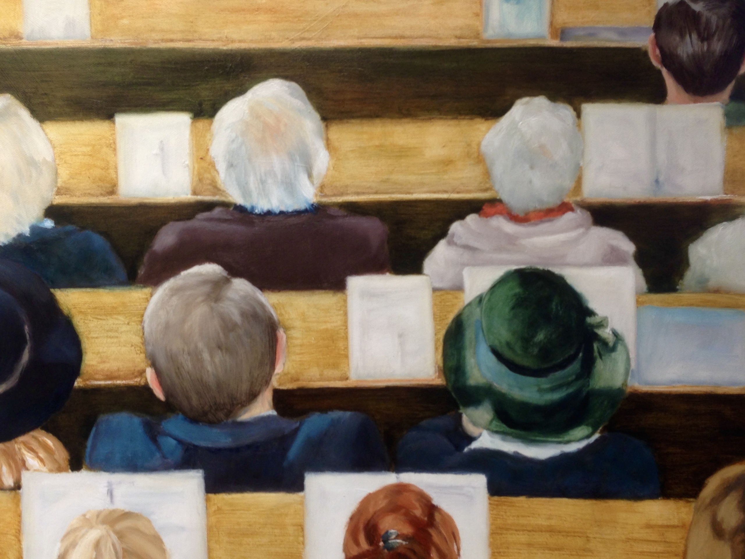Geen gezichten, geen gebaren — enkel hoofden, banken, boeken. In deze opstelling wordt iedereen gelijk: jong en oud, met of zonder hoed, ingedeeld in ritme. Het werk legt niet de nadruk op individuele expressie, maar op gedeelde ervaring.