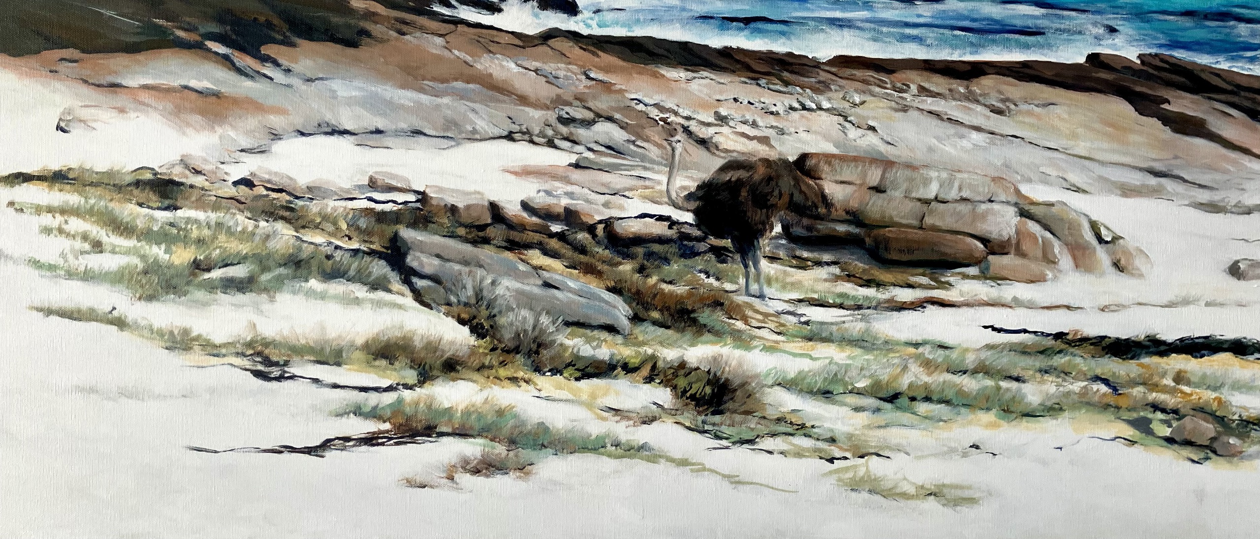 Schilderij in acrylverf Struisvogel aan zee , Zuid. Afrika