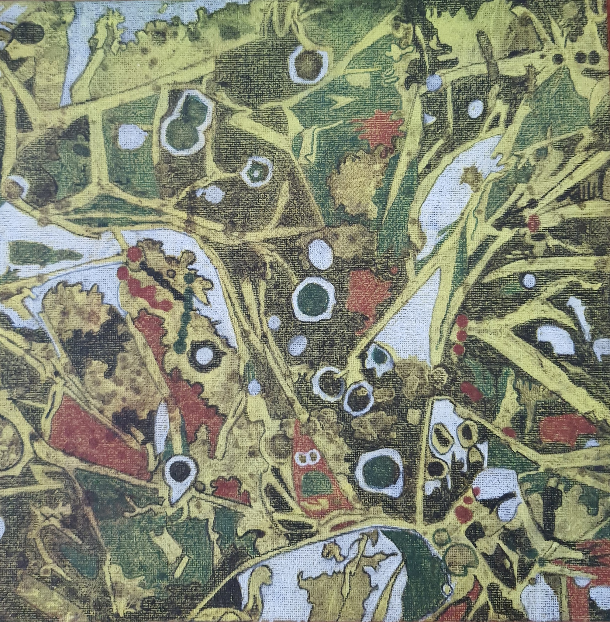 Stucturen 2. Waterige acrylverf met folie techniek op een canvas bord. Daar overheen een transparante gesso. Structuren met kleurpotloden aangebracht.