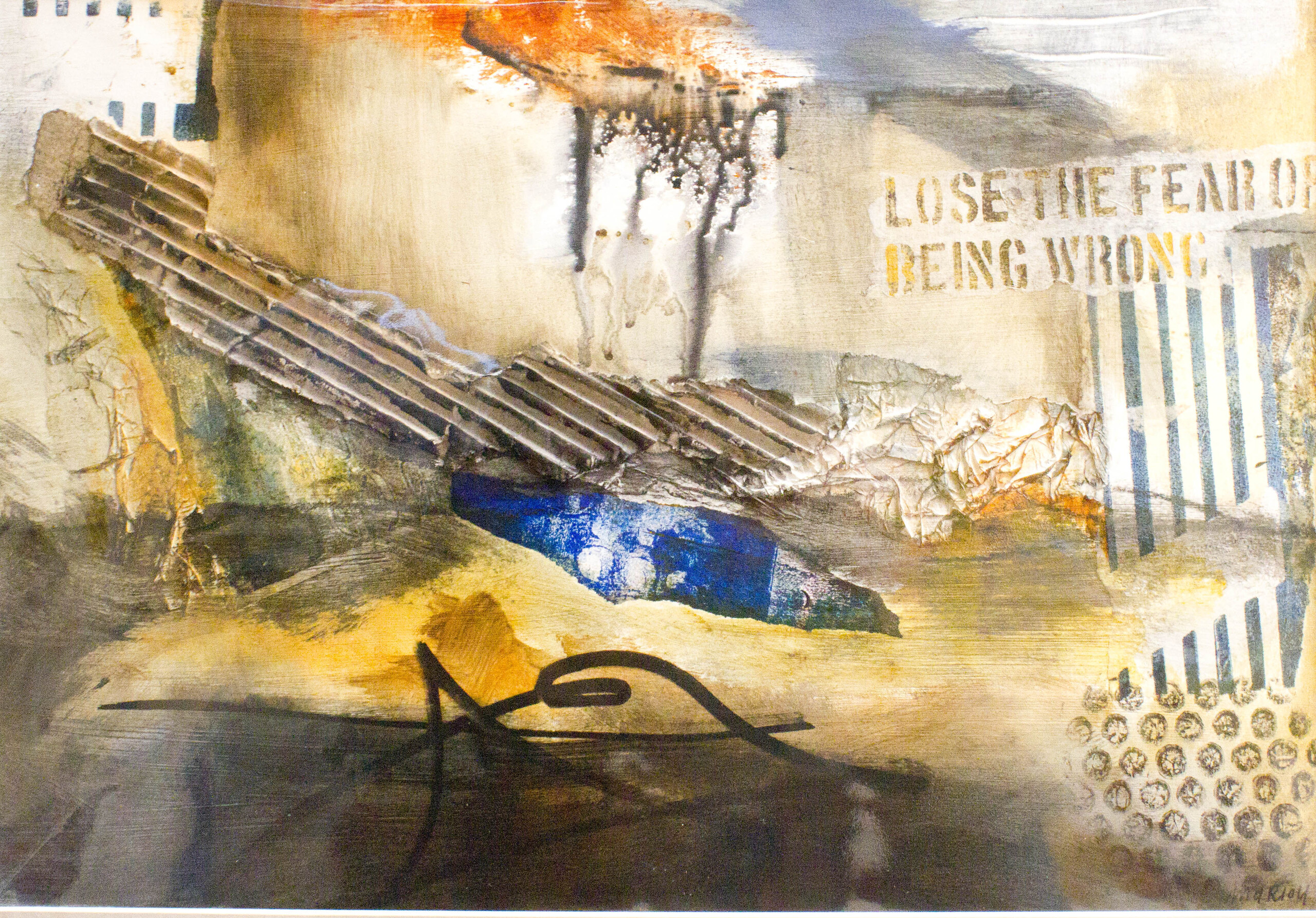 Abstract schilderij waarin natuurlijke materialen zijn verwerkt.