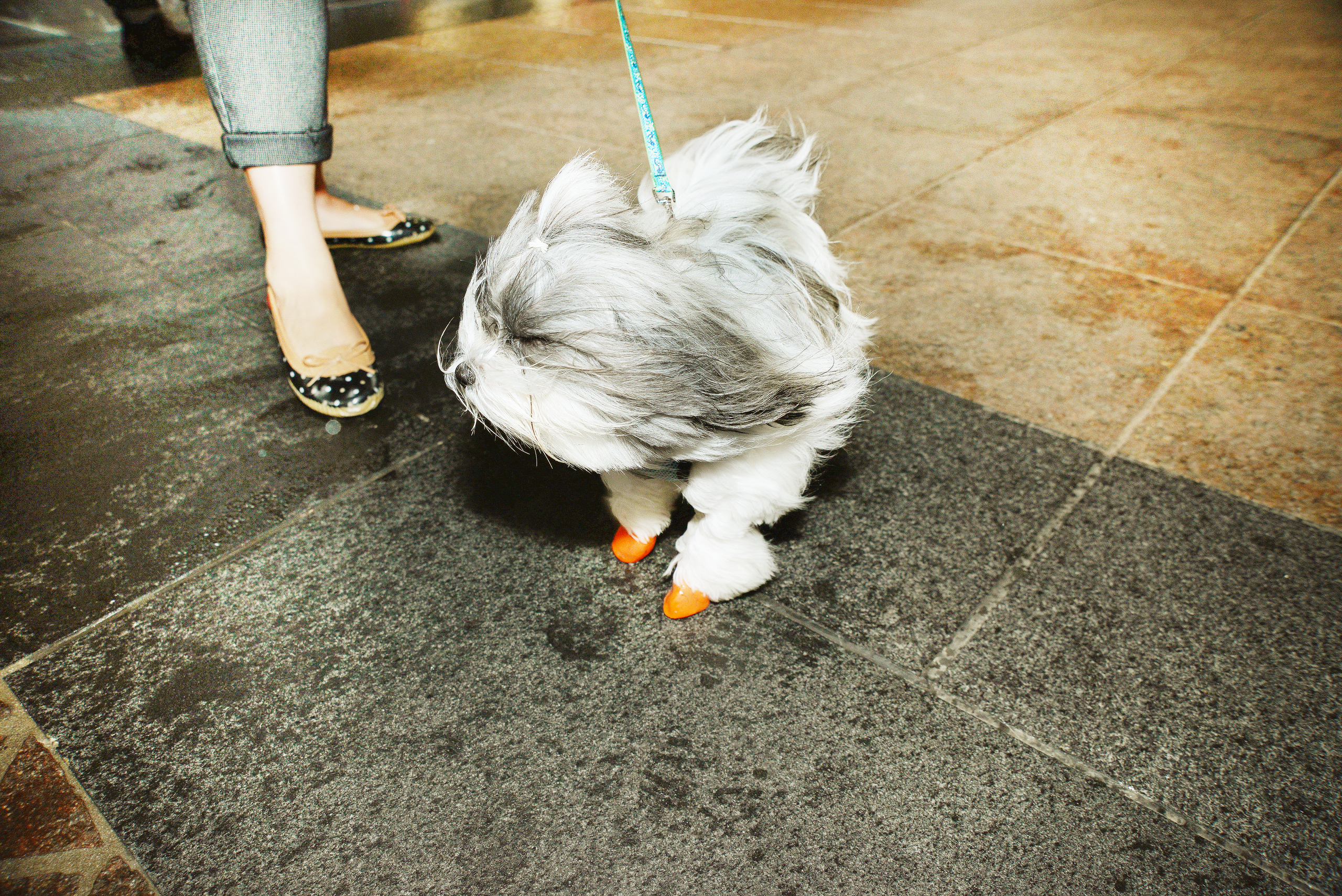 Deze hond werd uitgelaten terwijl het stormde en stortregende, hij had speciale schoentjes aan zodat hij geen natte pootjes zou krijgen! Financial district (Manhattan/ NYC)