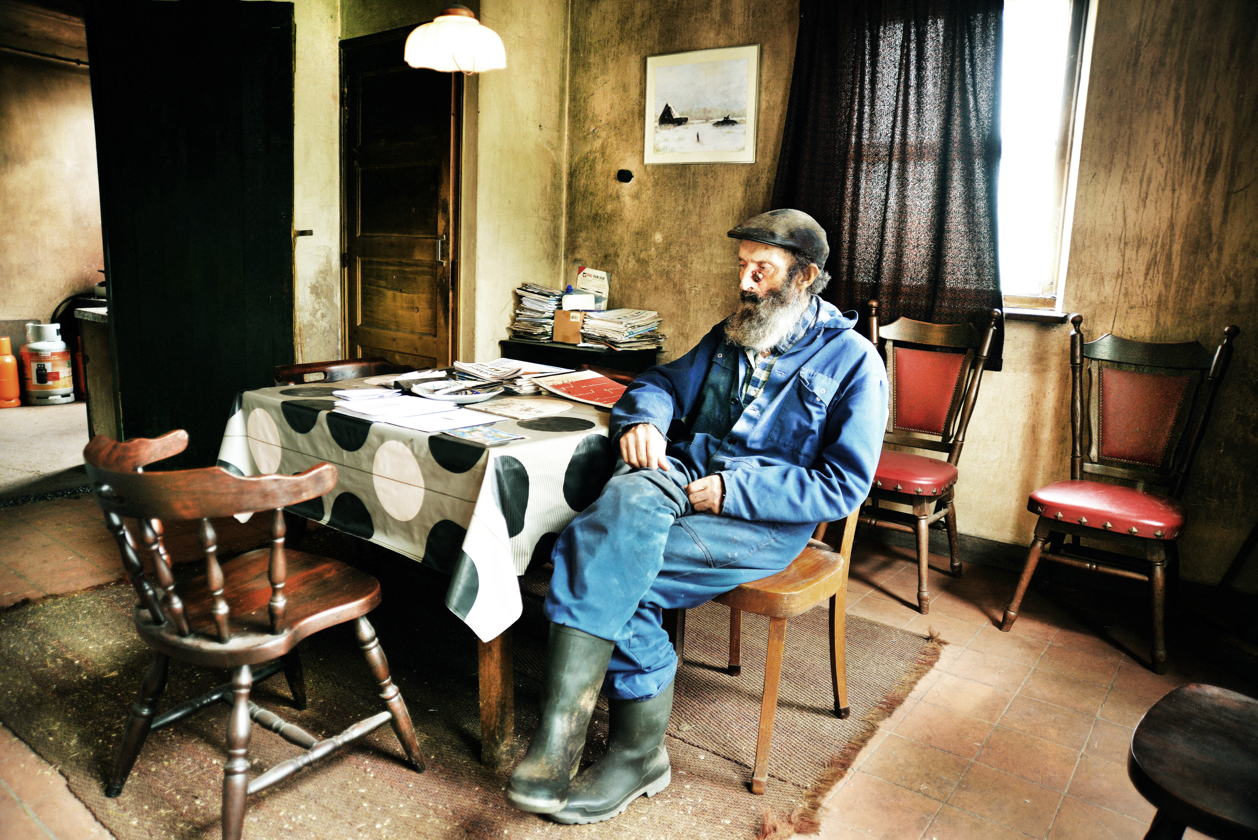 Peer Smulders aan zijn tafel, uit een langdurig "project" over Peer Smulders een eigenzinnige kleine boer in Maliskamp (Nbr.).