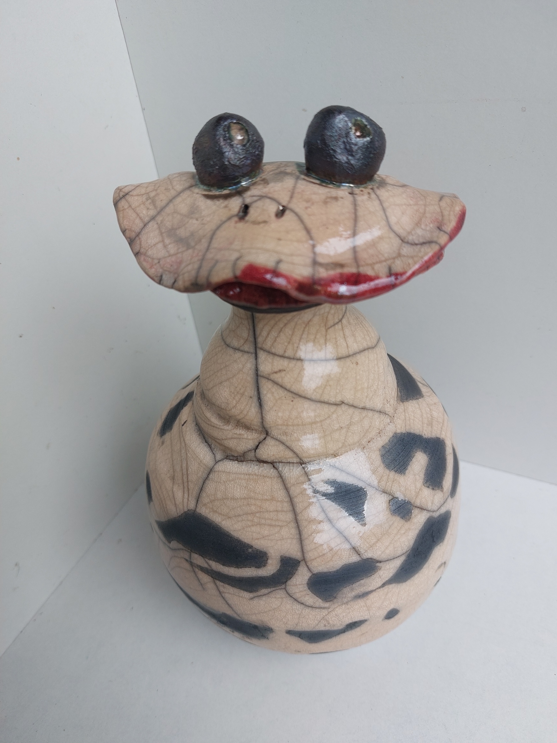 Vrolijke kikker, kan ook gebruikt worden als waterkan. Raku gestookt.