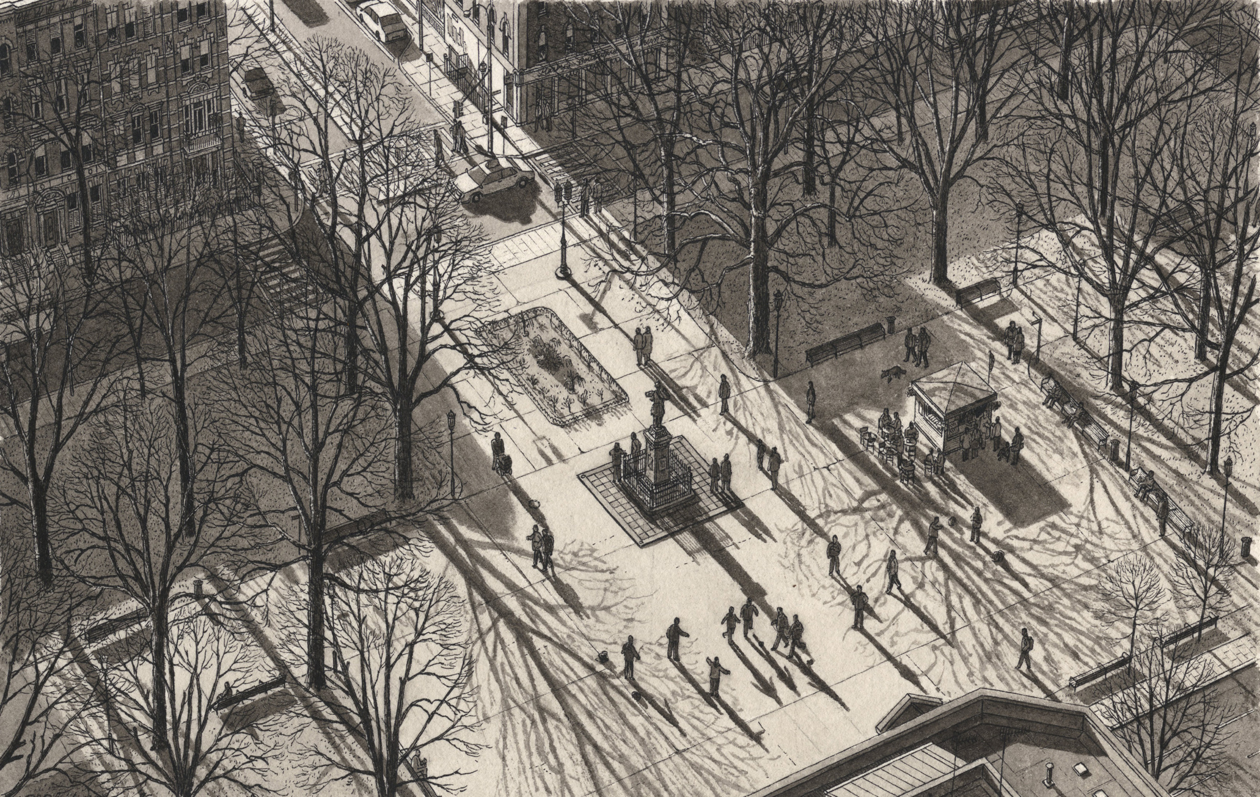 Dit is geen echte plek, maar ik heb een setting gecreëerd die past bij een beeld dat ik al lange tijd in gedachten had. Deze tekening drukt mijn interesse uit in de fascinerende, geometrische, haasr abstracte vormen van de langgerekte schaduwen op een zonnige winterdag.