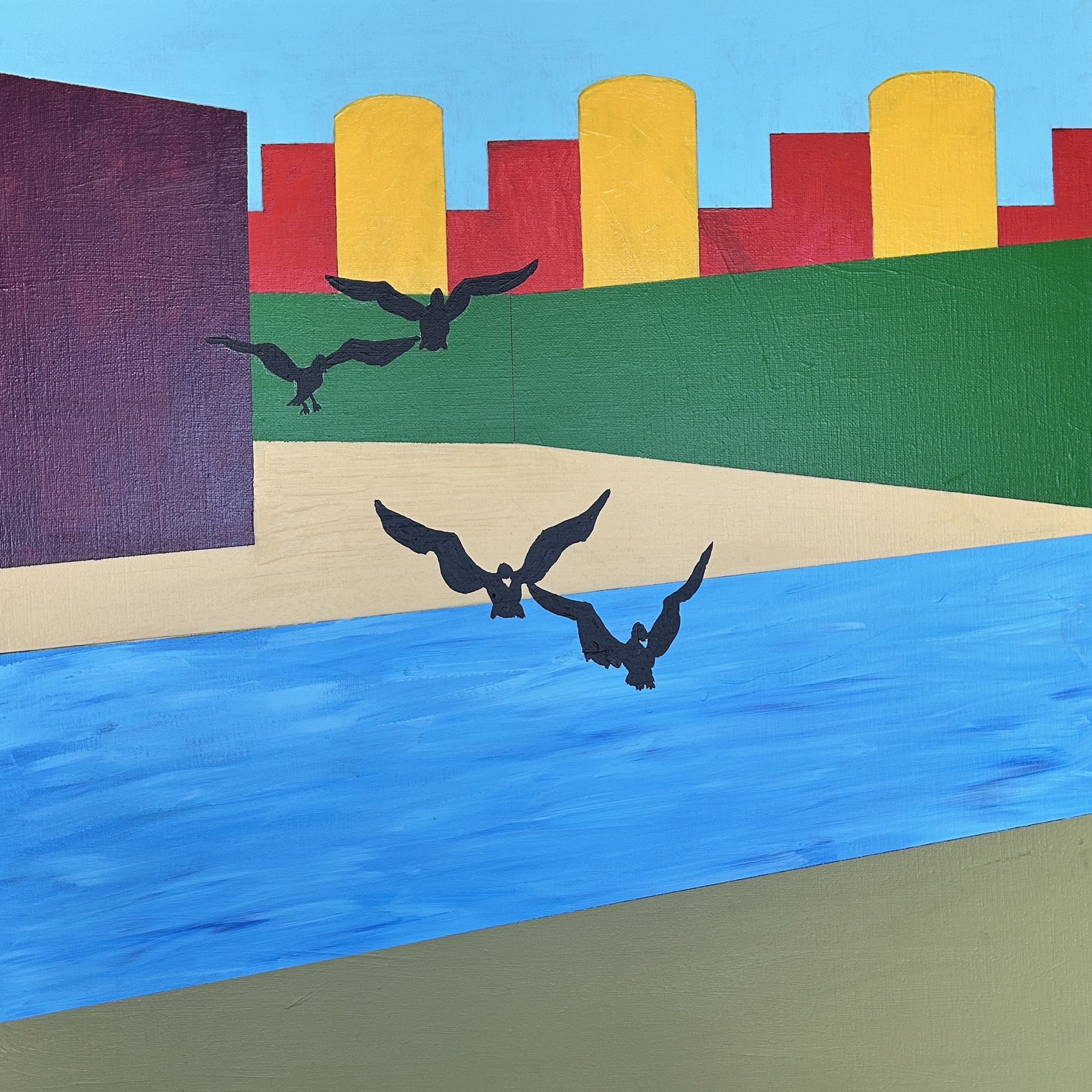 Ik schilder met acryl op doek met soms architectonische achtergronden. Met de menselijke figuren die ik erin aanbreng (geschilderd of als collage) probeer ik een verhaal te vertellen.