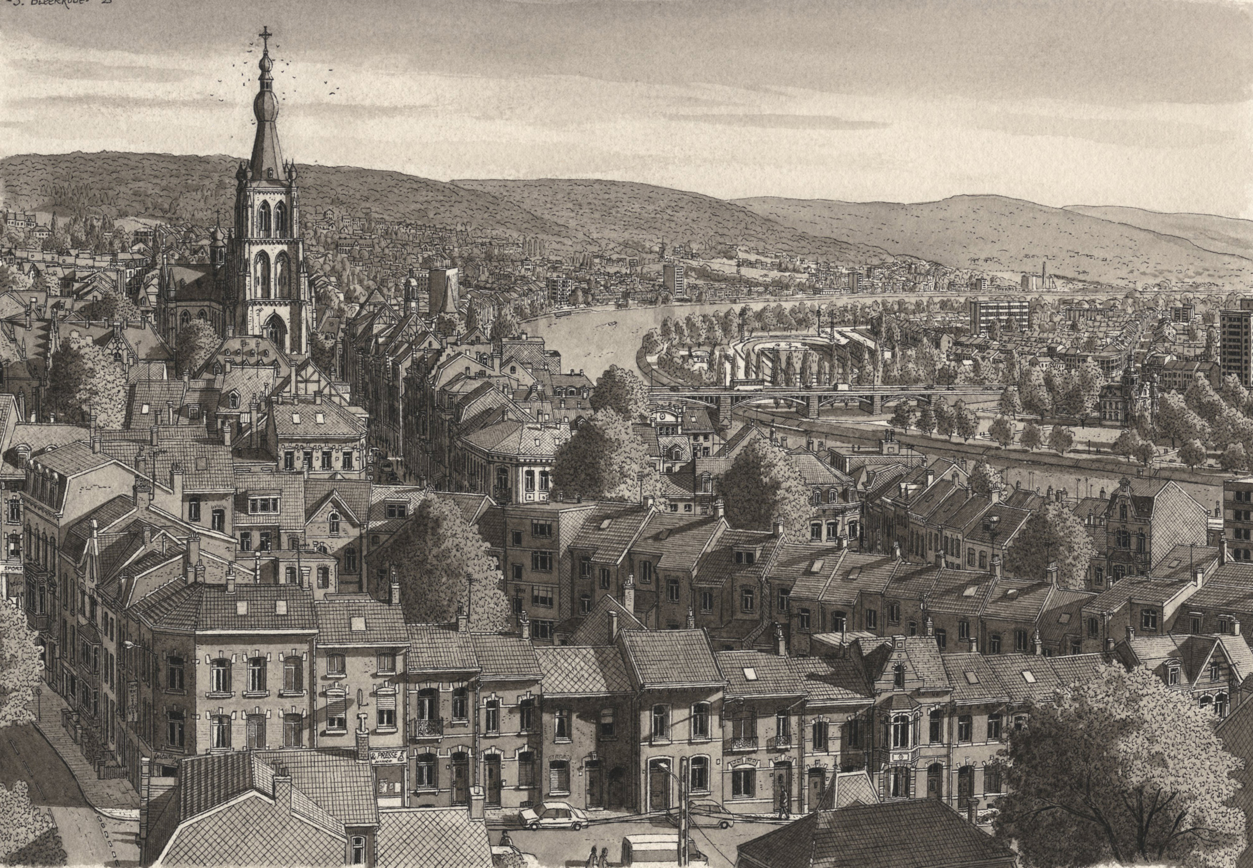 Deze denkbeeldige stad toont de architectuur van de Maasvallei tussen Dinant en Luik. De setting is geïmproviseerd, maar ik kreeg het idee voor deze tekening al een tijdje geleden toen ik met de trein langs de Maas naar Dinant reisde.