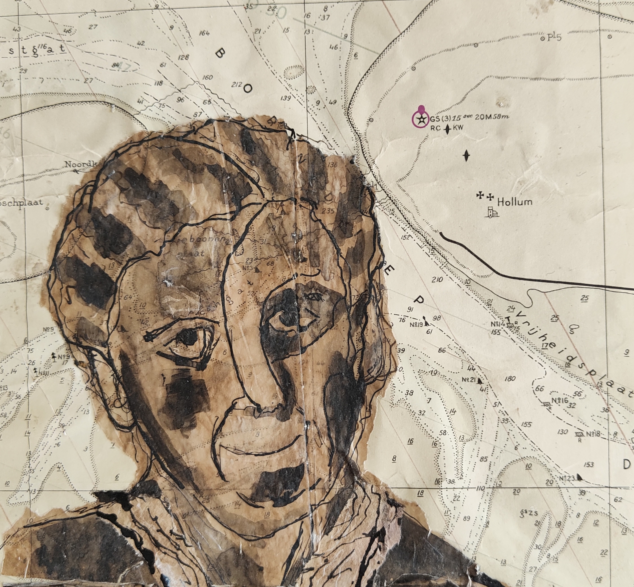Serie van 12. Collage eigen werk, monoprint, tekenen op oude wadden vaarkaart uit 1957, gevonden bij een kringloopwinkel
