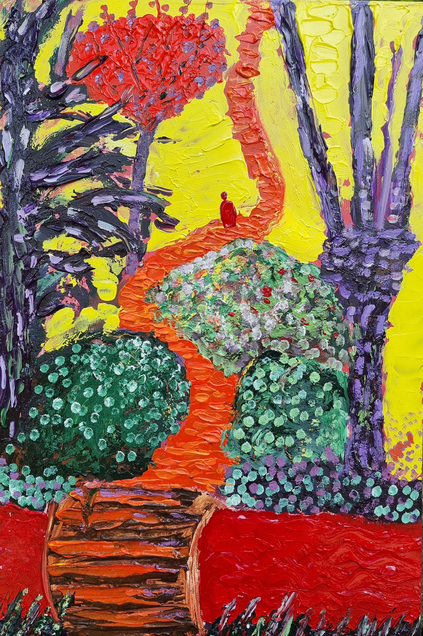 Waar gaat de weg naar toe? Ik weet het niet. Jij wel? Alleen op het pad.... wat gaat het brengen? In de stijl van Matthew Wong geschilderd bij @barteljee schilderweek