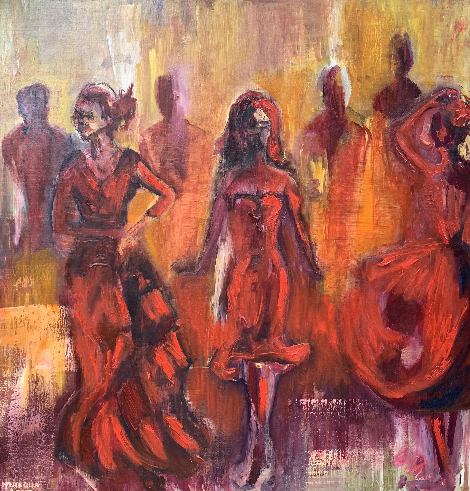 3 Danseressen op de voorgrond, kleurrijk geschilderd in acrylverf en olieverf op prachtig linnen doek 90x90 cm.