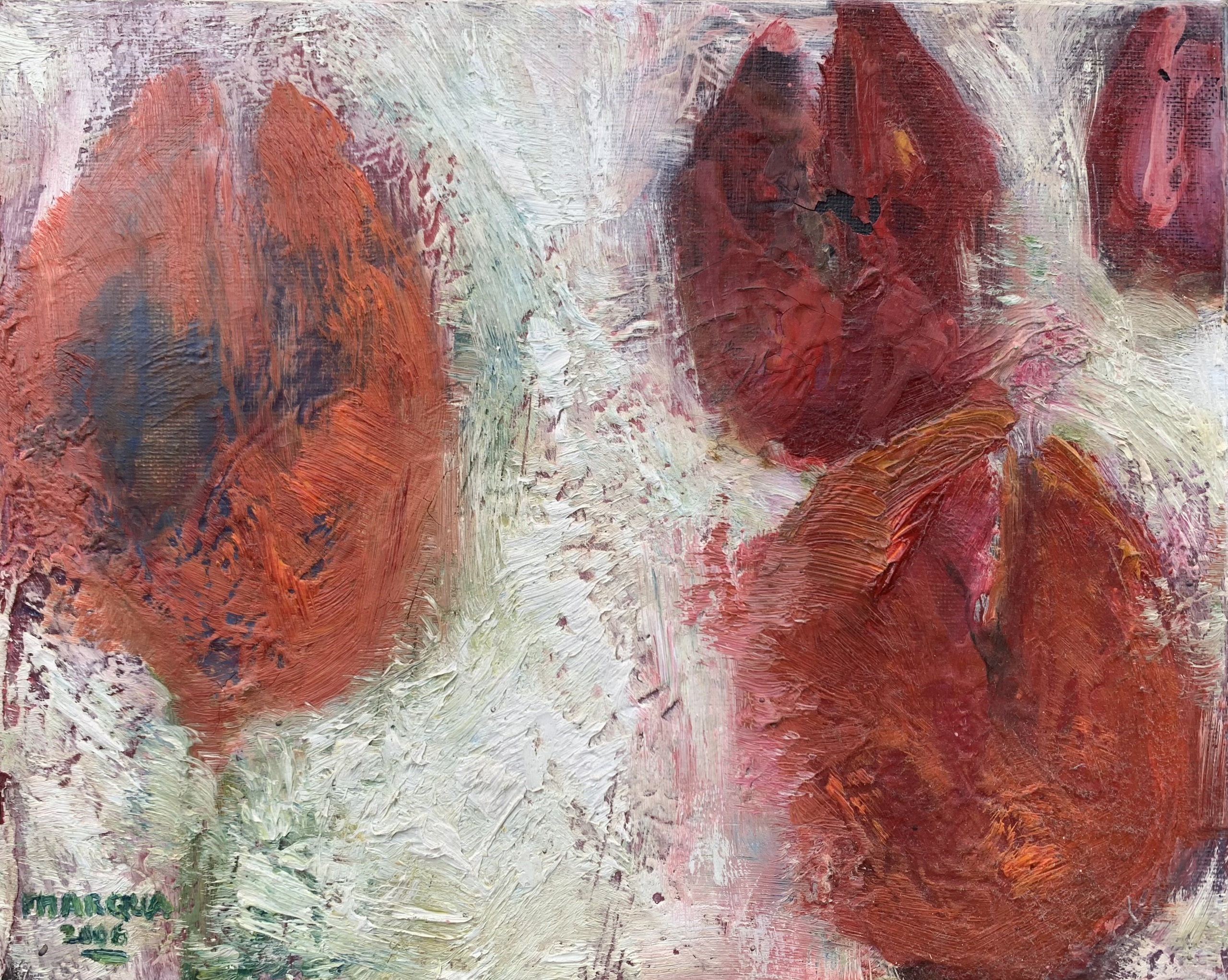 Bloemachtigen, geschilderd in olieverf en bijenwas op doek 24x30 cm.