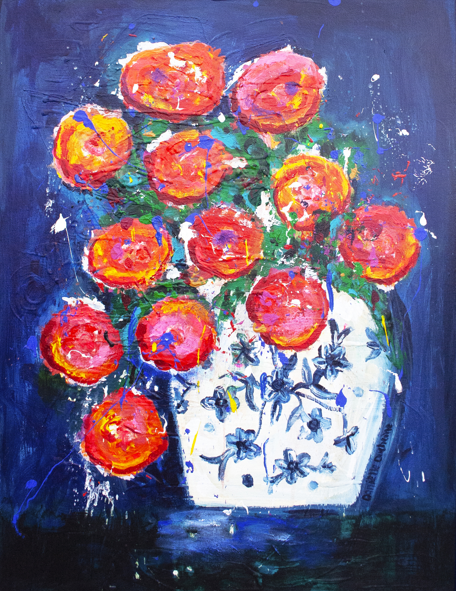 Een intuitief schilderij met een gemberpot met bloemen. Kleurrijk in combinatie met Delfs blauw!