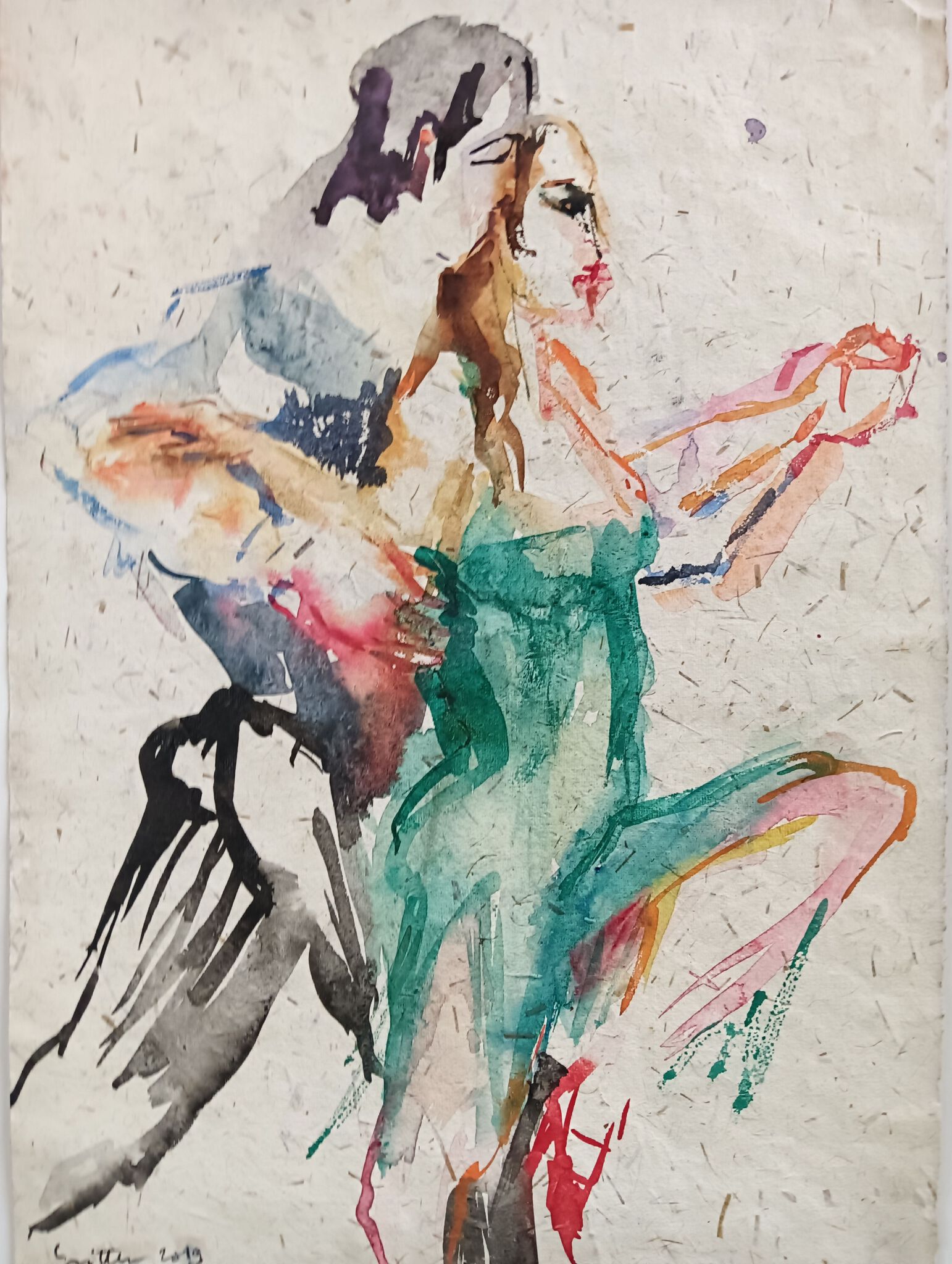 Schwung, intimiteit en stijl komen tot recht in deze aquarel van de tango.