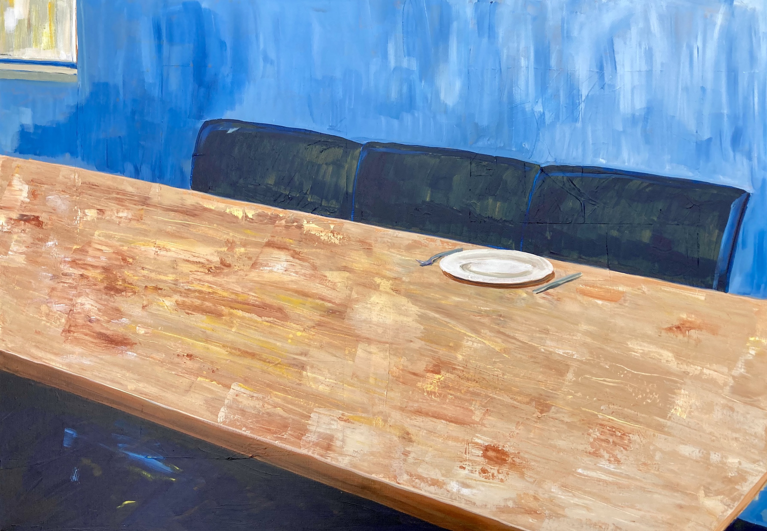 Dit werk ontstond bij het werken aan het thema 'aan tafel'. Daarbij denk je al snel aan gezelligheid. Maar veel mensen zitten iedere dag alleen aan tafel. Dit doek probeert dit gevoel uit te drukken.