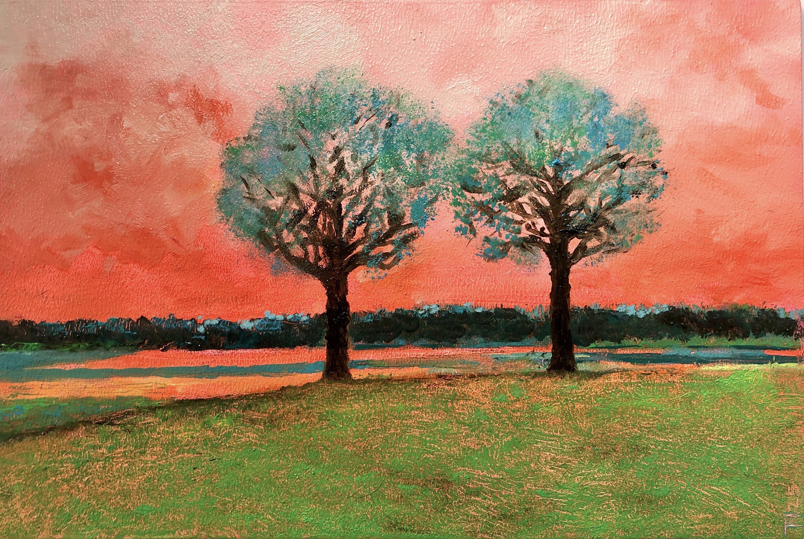 Broek Bossche #olieverf #kunst #bomen #uitzicht #rood #rose #bruin #roze #oranje #het #wolken #groen #kunstwerk #lucht #’s-hertogenbosch #zuiderplas #natuurschoon #landschapsschilderij #landweg #paneel #zuiderstrandweg #berkenhout #grasweide