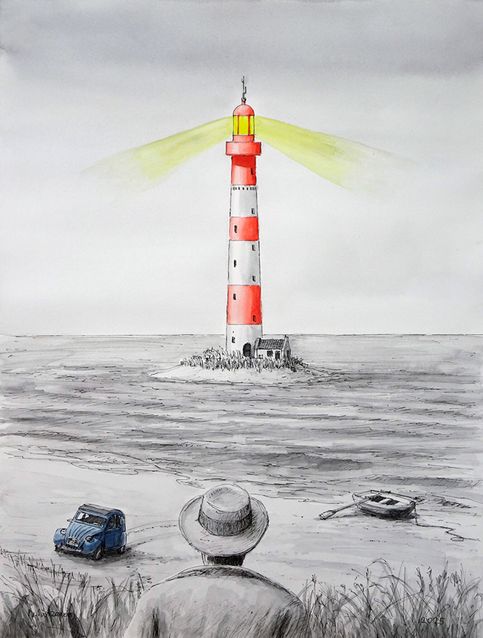 De tekening toont een vuurtoren op een klein eilandje in de zee, met een rood-wit gestreept patroon en een fel geel licht dat straalt. Op de voorgrond staat een persoon met een hoed die naar de vuurtoren kijkt, terwijl een blauwe auto en een kleine roeiboot op het strand staan. De tekening is gedetailleerd en heeft een rustige, grijze achtergrond die de vuurtoren en de omgeving benadrukt.