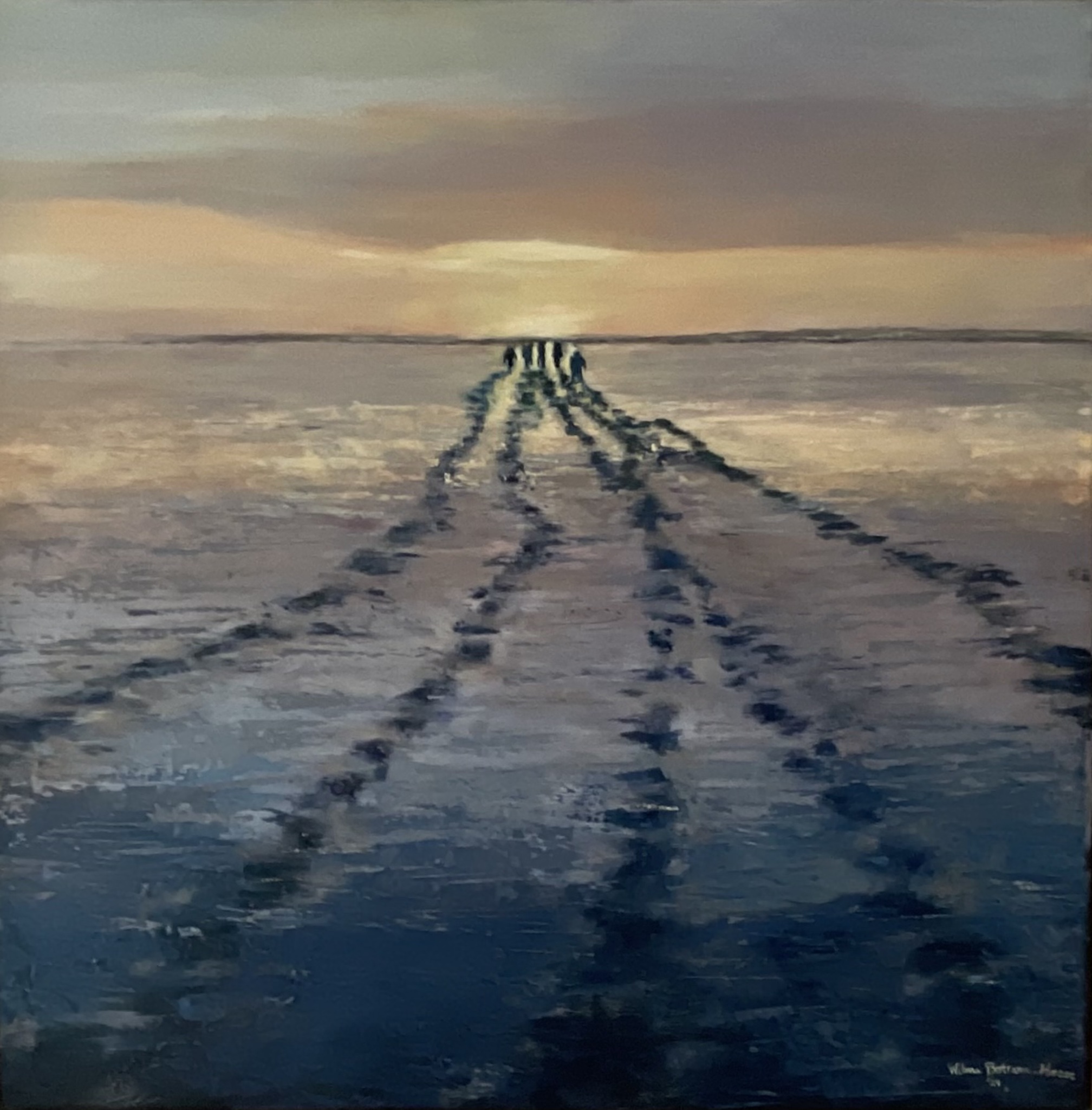 Uit de serie wadlopen olieverf op doek, in houten baklijst