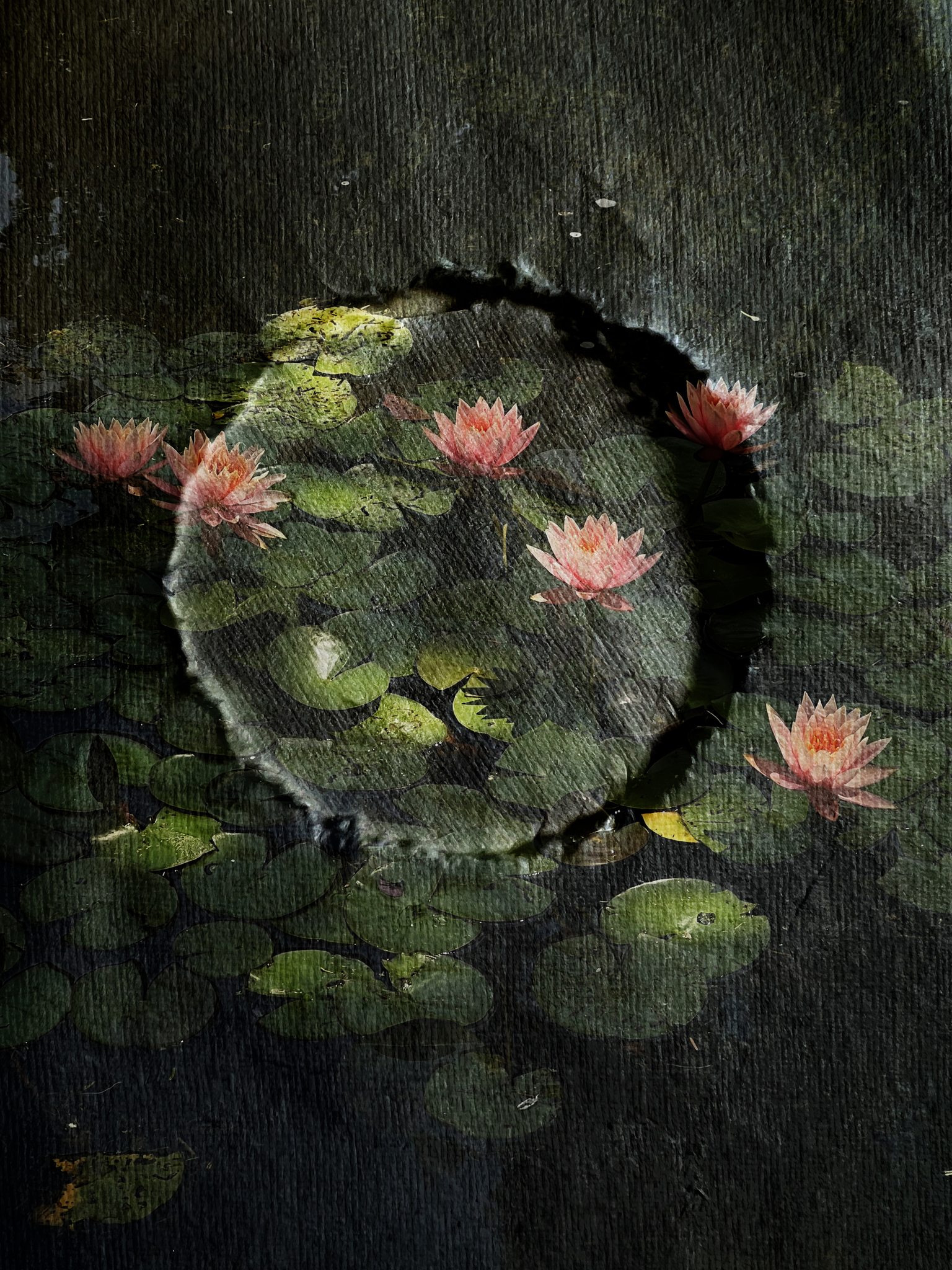 Water Bloem Donker Blad Fotomontage Cirkel Gat Waterlelie Ontspringen Put Nymphaea