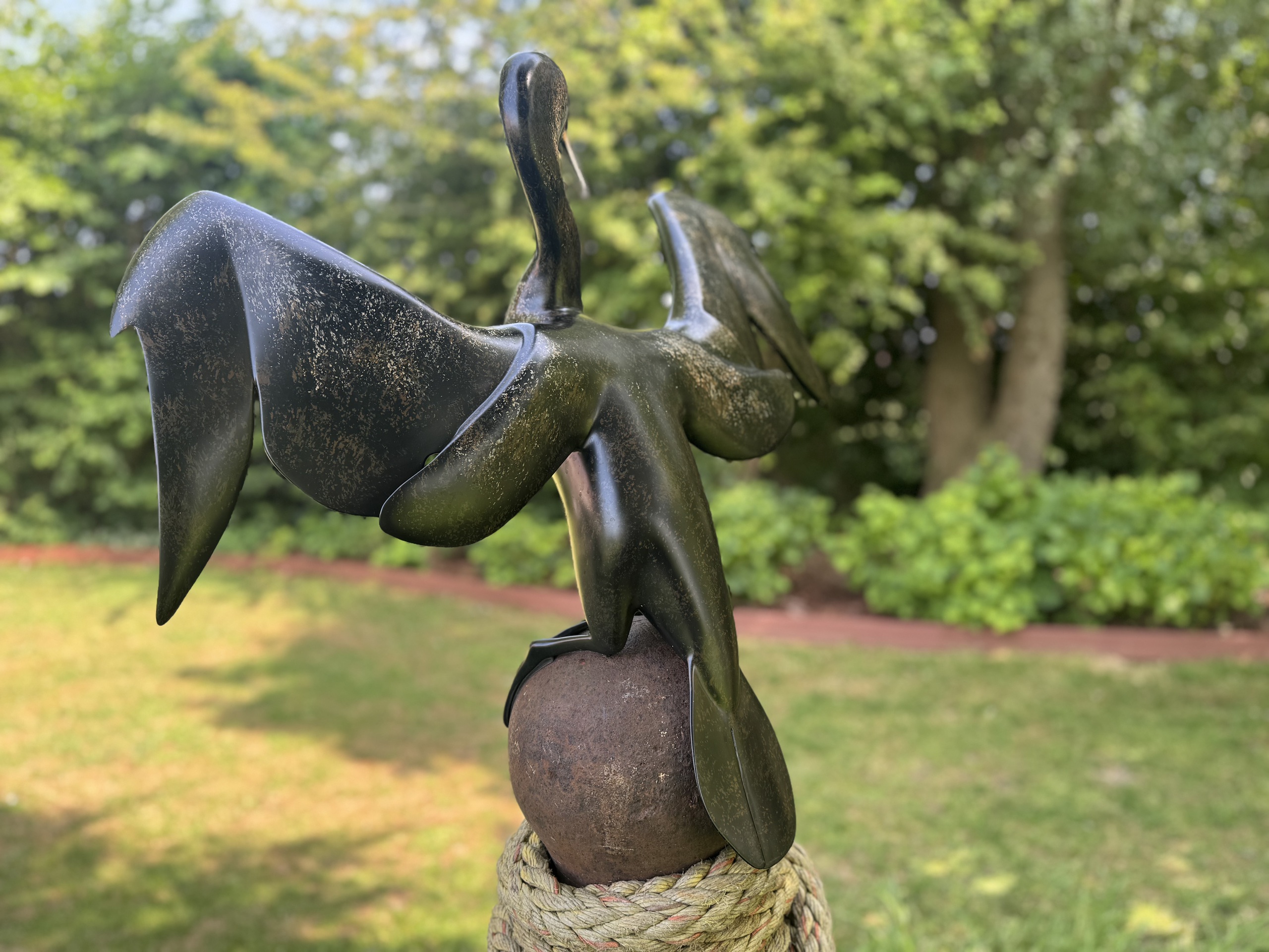 Aalscholver op echte gietijzeren meerpaal gegoten in Nederland jaar 1920 en komt uit omgeving Amsterdam(uniek stuk)