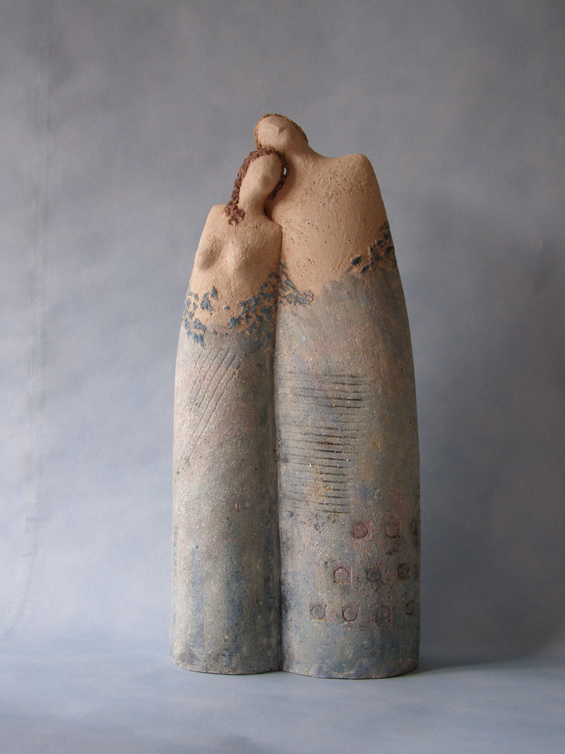 Dit liefdespaar is opgebouwd met plakken klei en verder gevormd met rolletjes. Gedecoreerd met gekleurde kleislibs. Electrisch gestookt op 1140 ºC