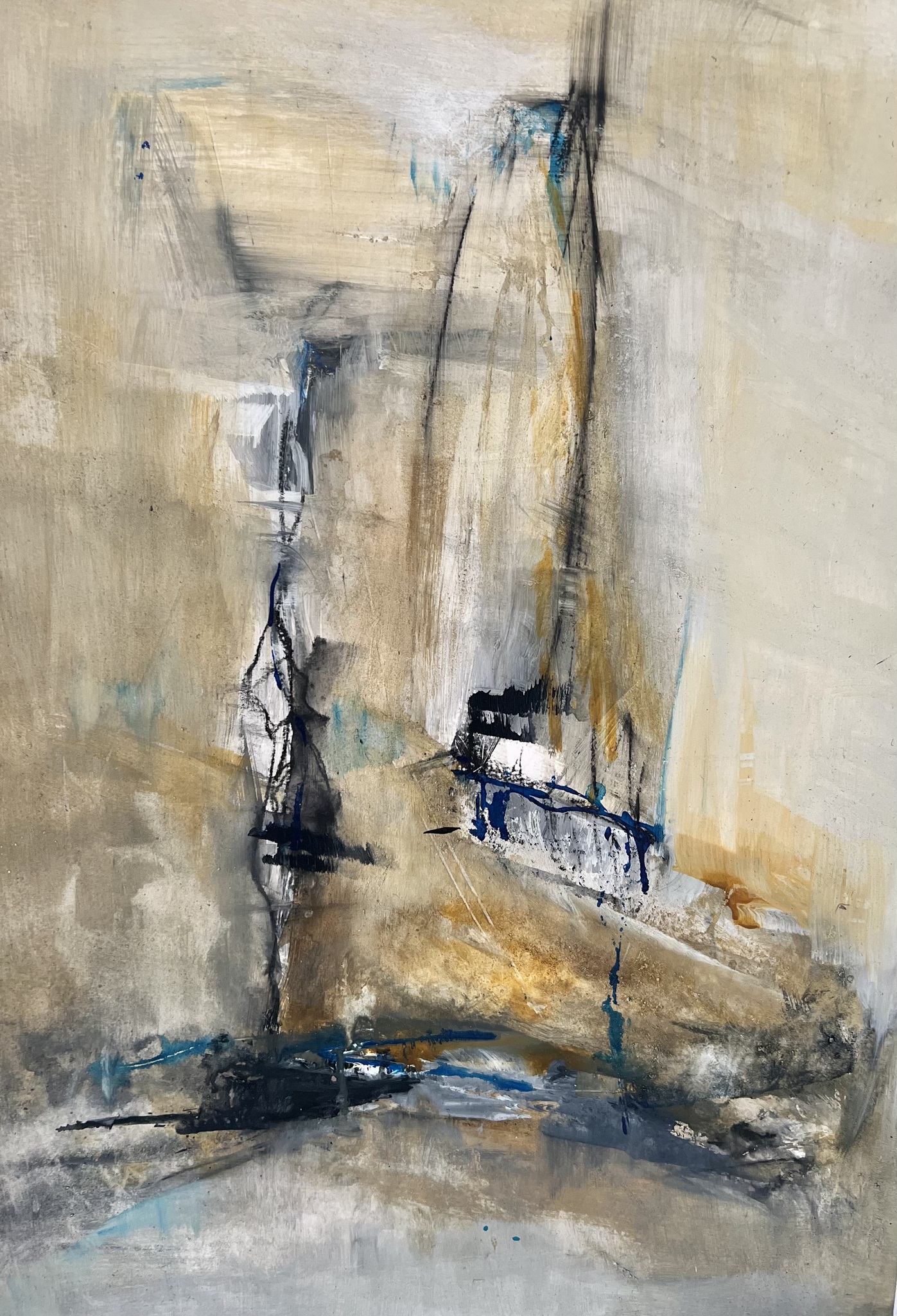 Met zijn abstracte lijnen, ruige penseelstreken en suggestie van een zeilschip wat gestrand is. Het roept spanning, beweging en impact op – iets wat goed past bij de dynamiek en contrasten in het schilderij: de scherpe lijnen, het schurende kleurgebruik, en de abstracte vormen die een botsing of breuk suggereren.