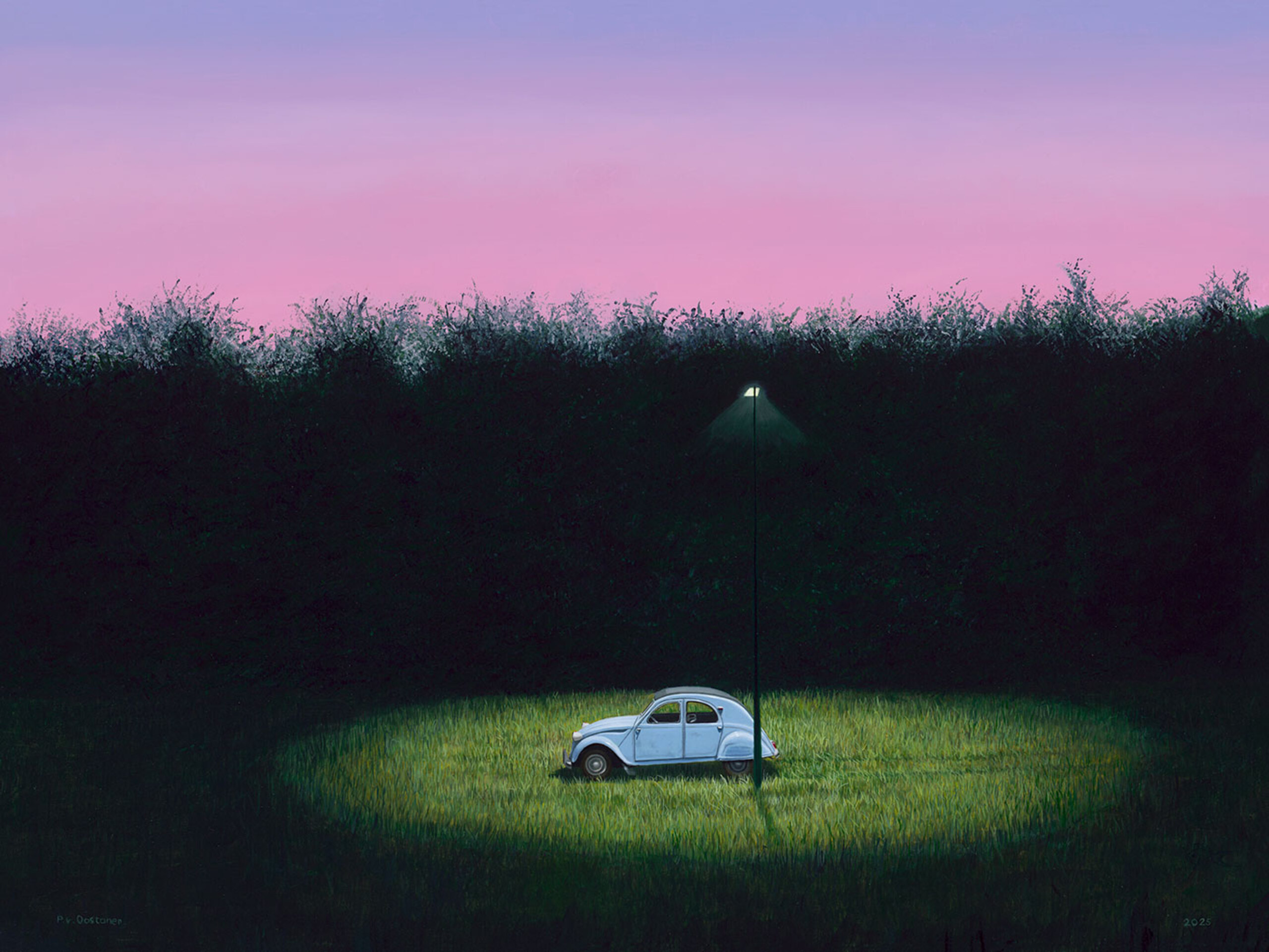 Dit schilderij toont een serene en enigszins surrealistische scène bij schemering. Een eenzame lichtblauwe auto, een citroën 2cv, staat geparkeerd in een helder verlichte cirkel van groen gras, direct onder een straatlantaarn die als enige lichtbron fungeert. Op de achtergrond is een donker bos te zien dat afsteekt tegen een roze-paarse avondlucht, wat een gevoel van stilte en isolement creëert.