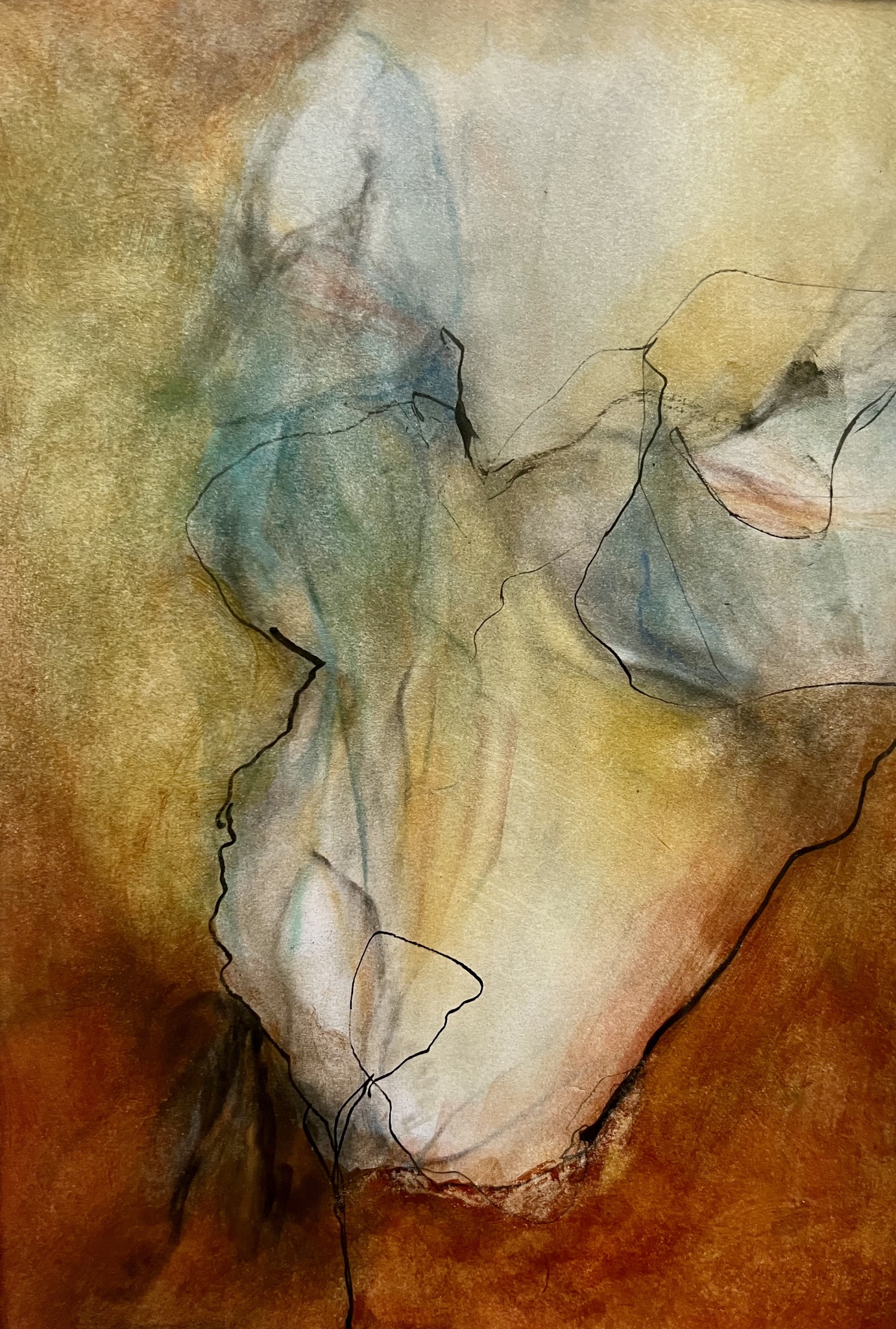 Dit schilderij ademt een zachte, spirituele gloed — met een bijna etherische figuur die lijkt op te doemen uit het licht, omringd door aarde- en luchttonen. De fijne lijnen geven het iets kwetsbaars en mysterieus.