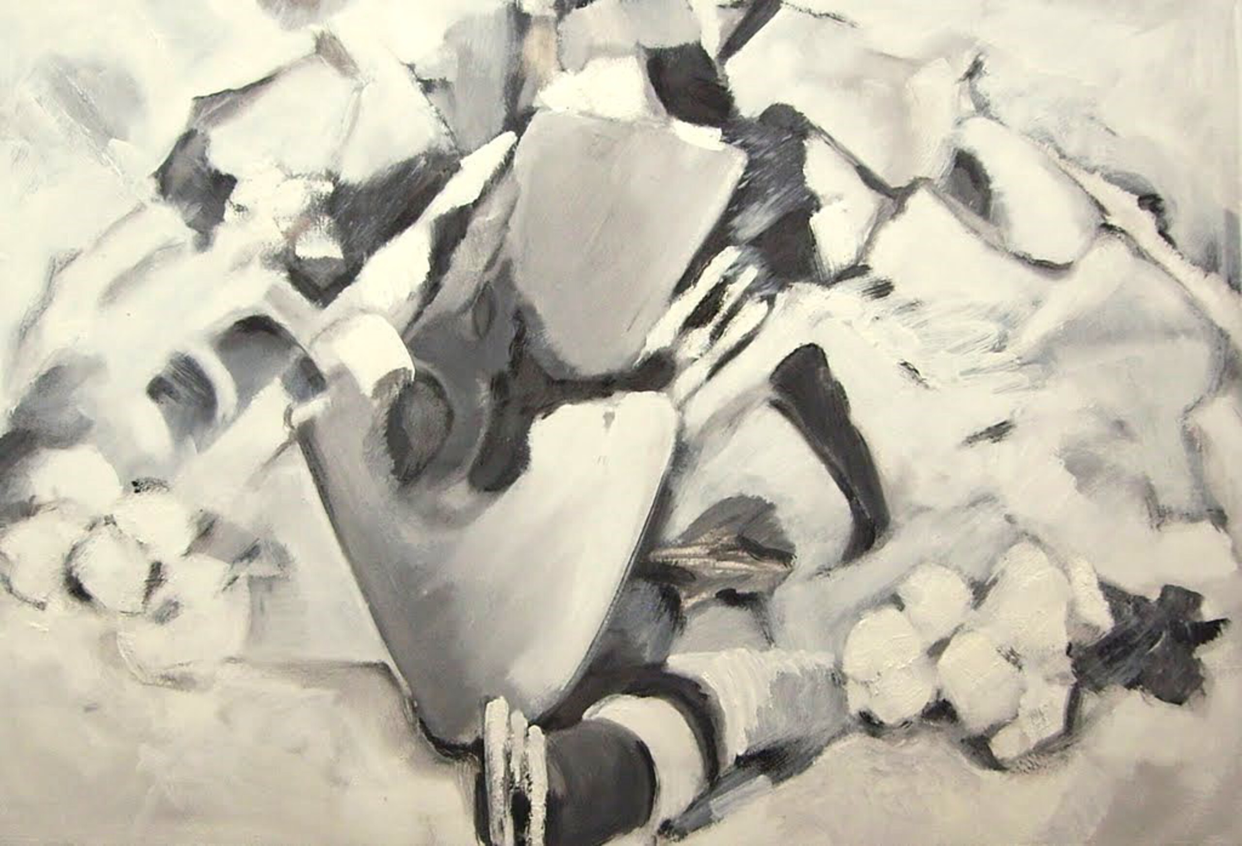 Geabstraheerd stilleven in zwarte en witte olieverf.