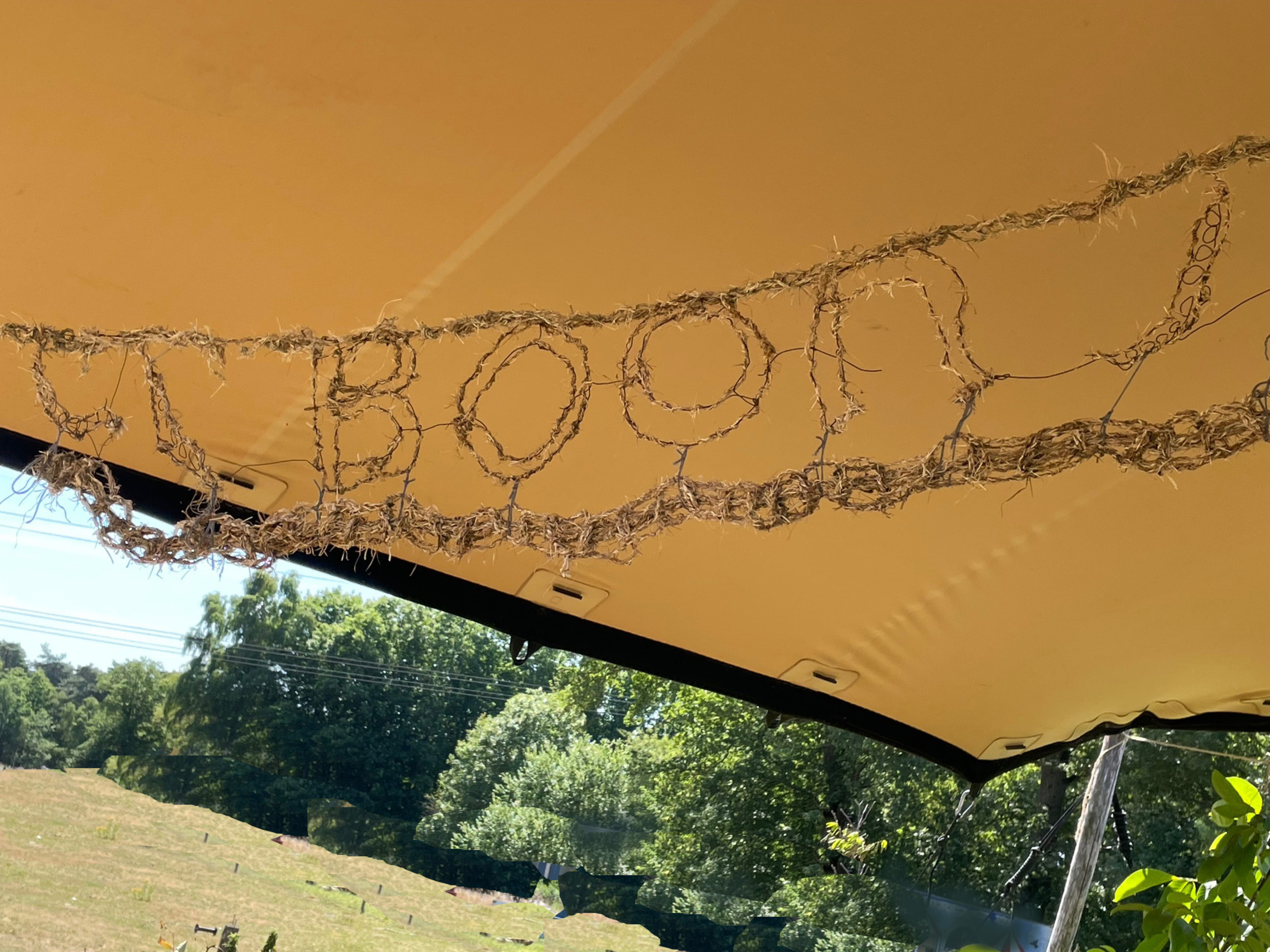 In het boek 'Een vlecht van heilig gras' van Robin Wall Kimmerer ontdekte ik de legende van haar inheems-Amerikaanse voorouders over DE DRIE ZUSSEN. Deze legende over mais- boon- pompoen benadrukt de wederkerige afhankelijkheid en samenwerking van planten en mensen. MAIS groeit omhoog. De BOON maakt gebruik van de stevige maisstengel en klimt zo omhoog. De wortel van de boon heeft stikstofbindende knobbeltjes, natuurlijke bemesting voor alle planten. En om uitdroging van de grond door de zon te voorkomen groeit de POMPOEN met zijn wijde bladeren laag over de grond. Zij zorgen zo als drie zussen goed voor elkaar! De slingers zijn ijzerdraad met gevlochten gras.