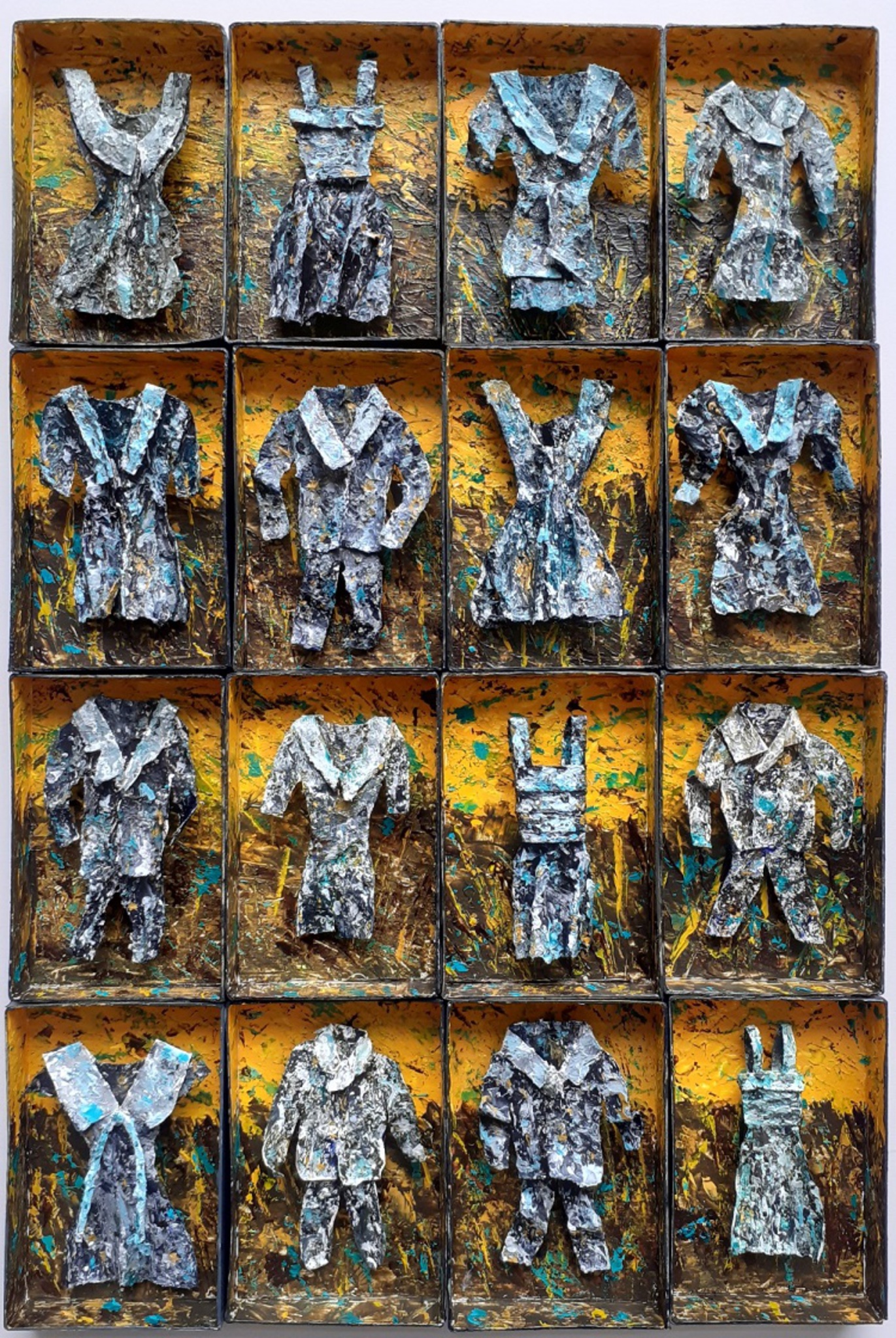 Pakje Kunst Klein Jurk Acryl Mixed Media Doosje Geel Grijs