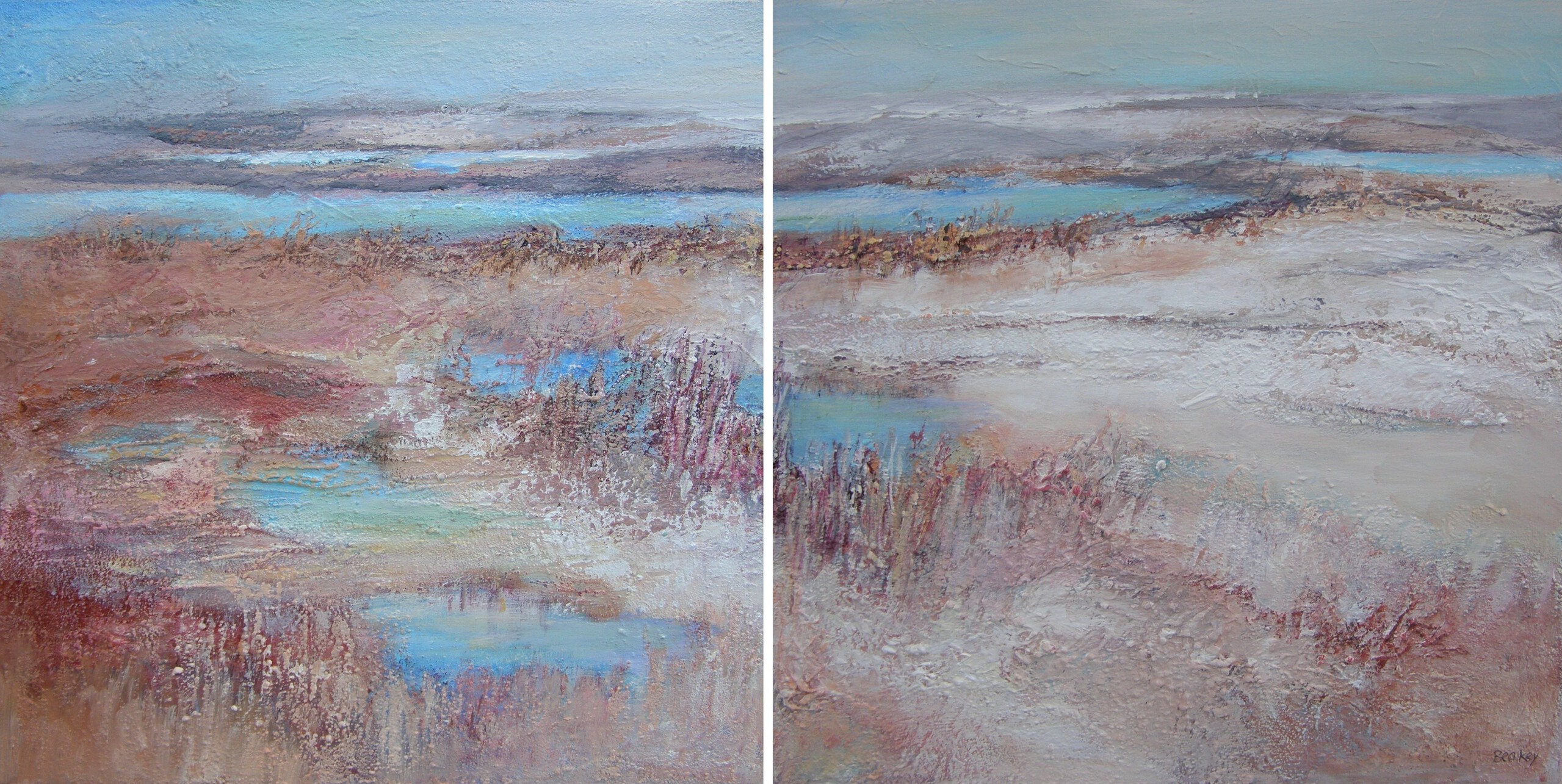 Haar schilderijen in gemengde techniek zijn geinspireerd door haar reizen in binnen-en buitenland. Schetsen en aantekeningen zijn het vertrekpunt, maar worden tot hun essentie in vorm en kleur teruggebracht.