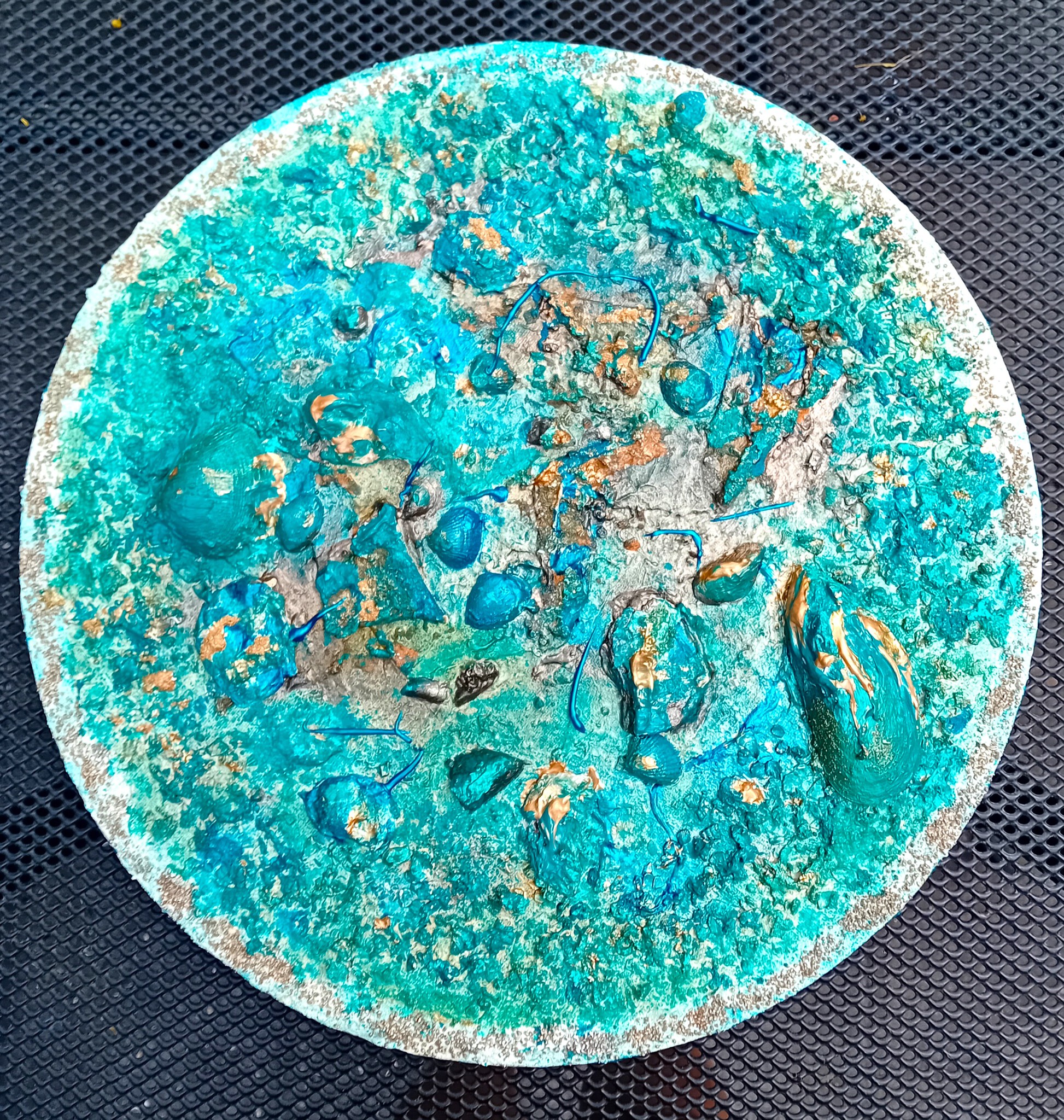 Eindelijk weer eens met een grote glimlach verder gewerkt aan dit ronde doek met verzamelde schatten van zee en strand..... Wat heb ik dit gemist, en waarom eigenlijk...? Is ook dit niet heel simpel een kwestie van andere keuzes maken? In ieder geval heel blij met dit eindresultaat!