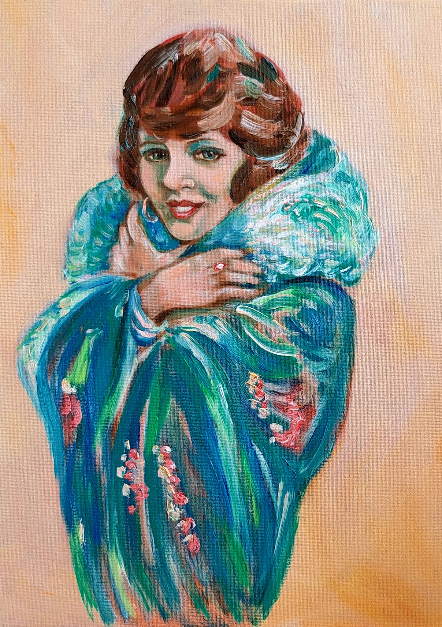 Vrouwenportret jaren 20 met bontkraag, incl.lijst