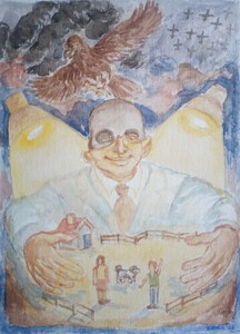Installatie. Acryl, gips hout, stalen elementen, plastic wieltjes, touw en ijzerdraad.