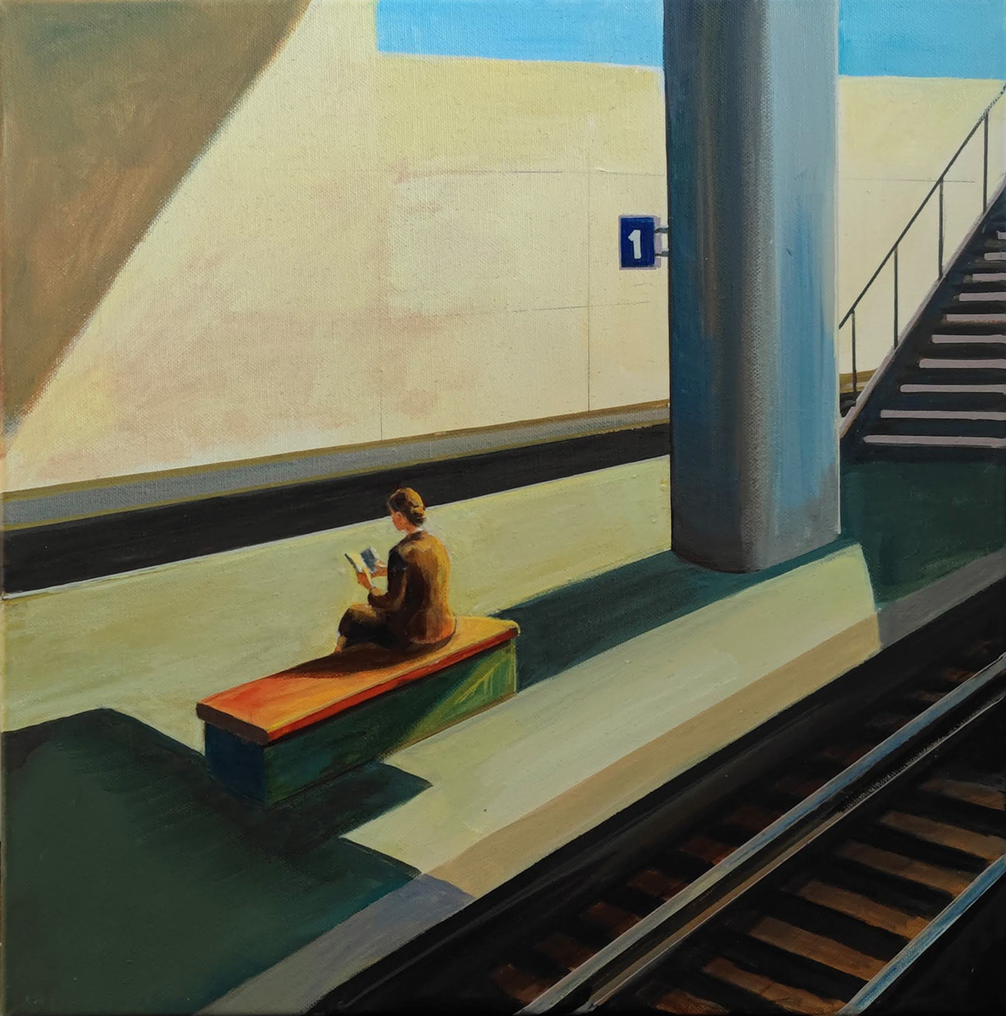 Een lezeres op een perron, wachtend in het zonlicht op een trein.